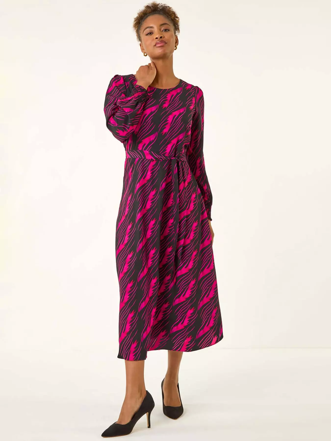 RomanAbstract Feather Shirred Midi Dress - Pink