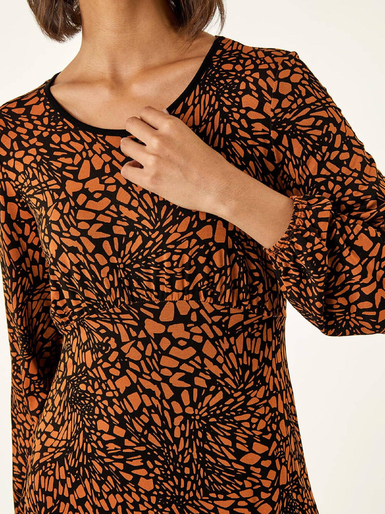Roman Abstract Print Gathered Stretch Dress - TanTurn heads this season with this abstract print knee-length dress. The classic round neckline complements the gathered bust and empire waistline for a flattering fit. Designed with long cuff sleeves that add elegance to this dress cut from a stretch jerse