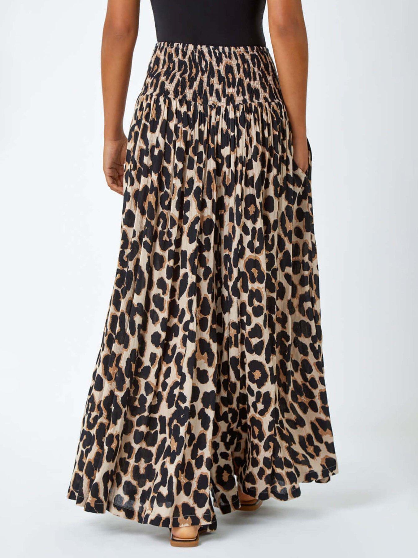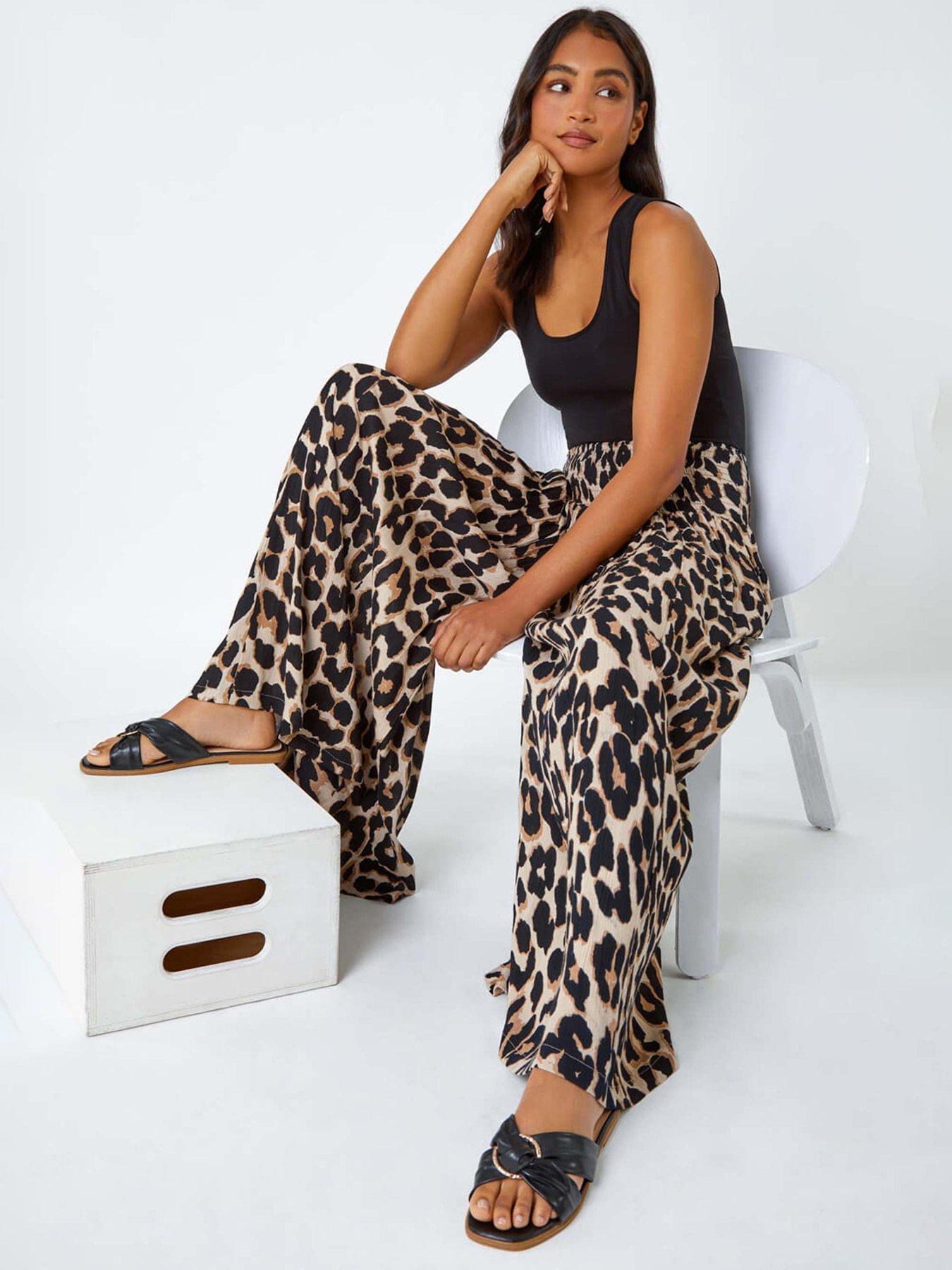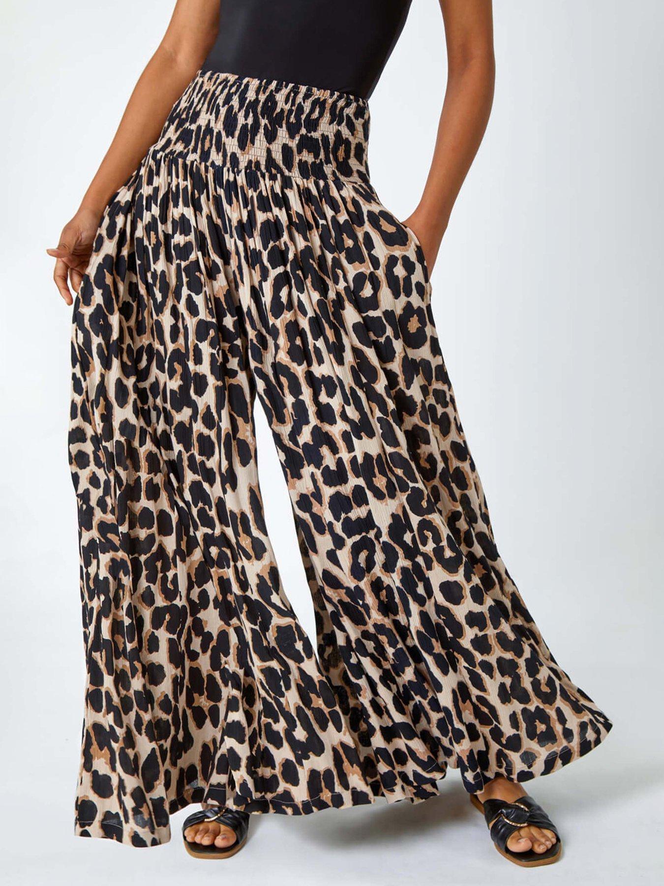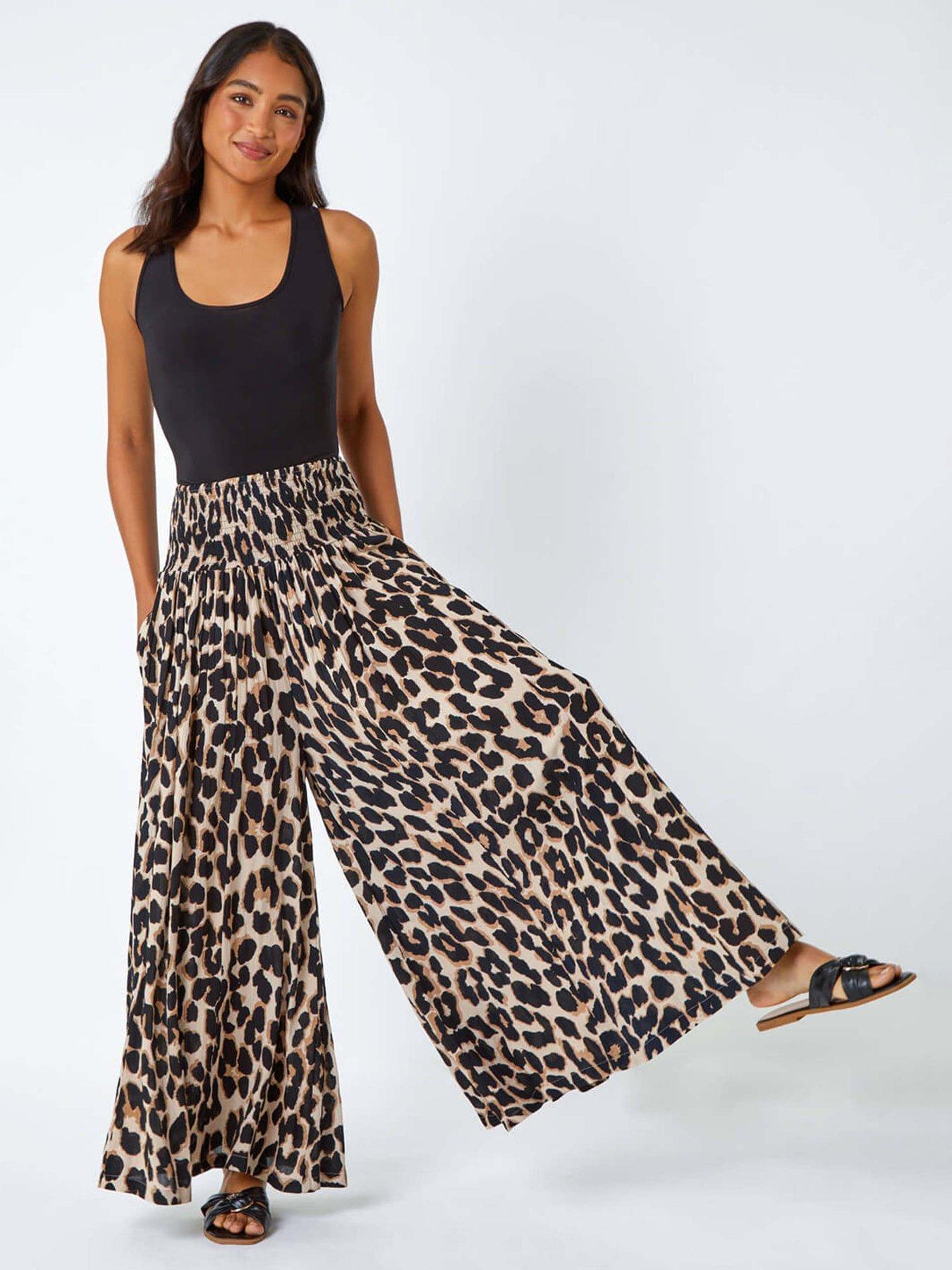 Roman Animal Shirred Palazzo Stretch TrouserThis style is ONE SIZE and will suit ladies between size 10 and 24. Feel the breeze all Summer long with these fabulous wide leg palazzo trousers. Adorned in a timeless leopard print, these elasticated trousers are an easy to wear style that will take your outfits to the next level. Detailed with side angled pockets and an thick shirred waistband these trousers ensure all day comfort. A great solution for stress-free holiday dressing and easy to throw on and go for that relaxed Summer feel. Pair with sandals and a simple tee and let the trousers do the talking!