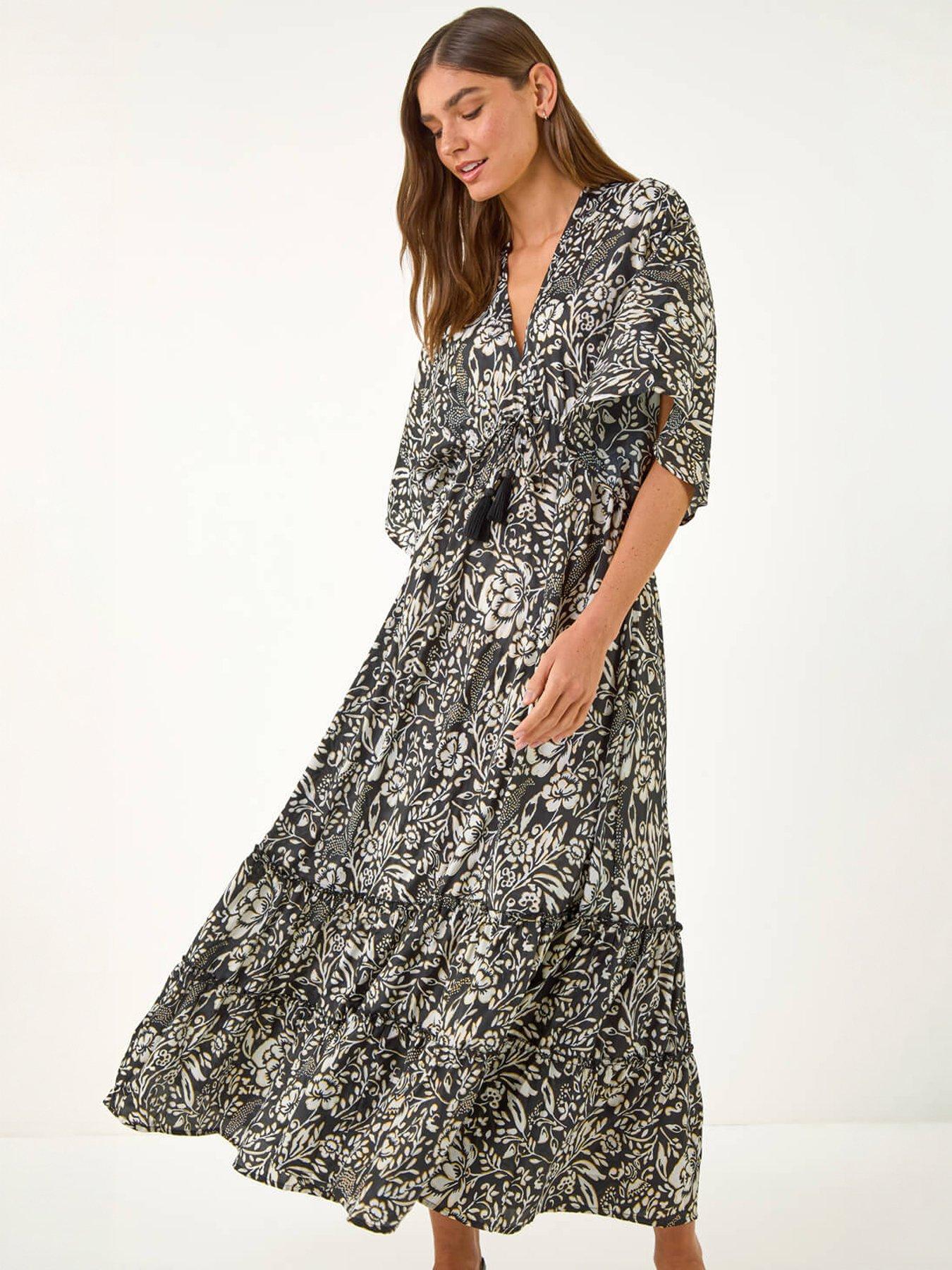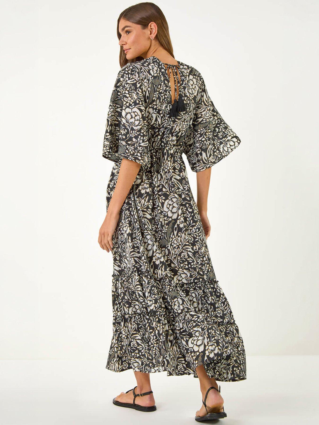 Roman Boho Floral Print V-Neck Maxi DressEmbrace your inner bohemian with this stunning floral print maxi dress. Effortlessly chic this dress features short batwing sleeves and a feminine V-neckline. The gathered waist creates a flattering fit while the frill hem adds a touch of whimsical charm. Crafted from a comfortable woven fabric this beauty is perfect for daytime outings or special events. Complete your outfit by styling with a denim jacket and wedged heels for a Spring Summer look!