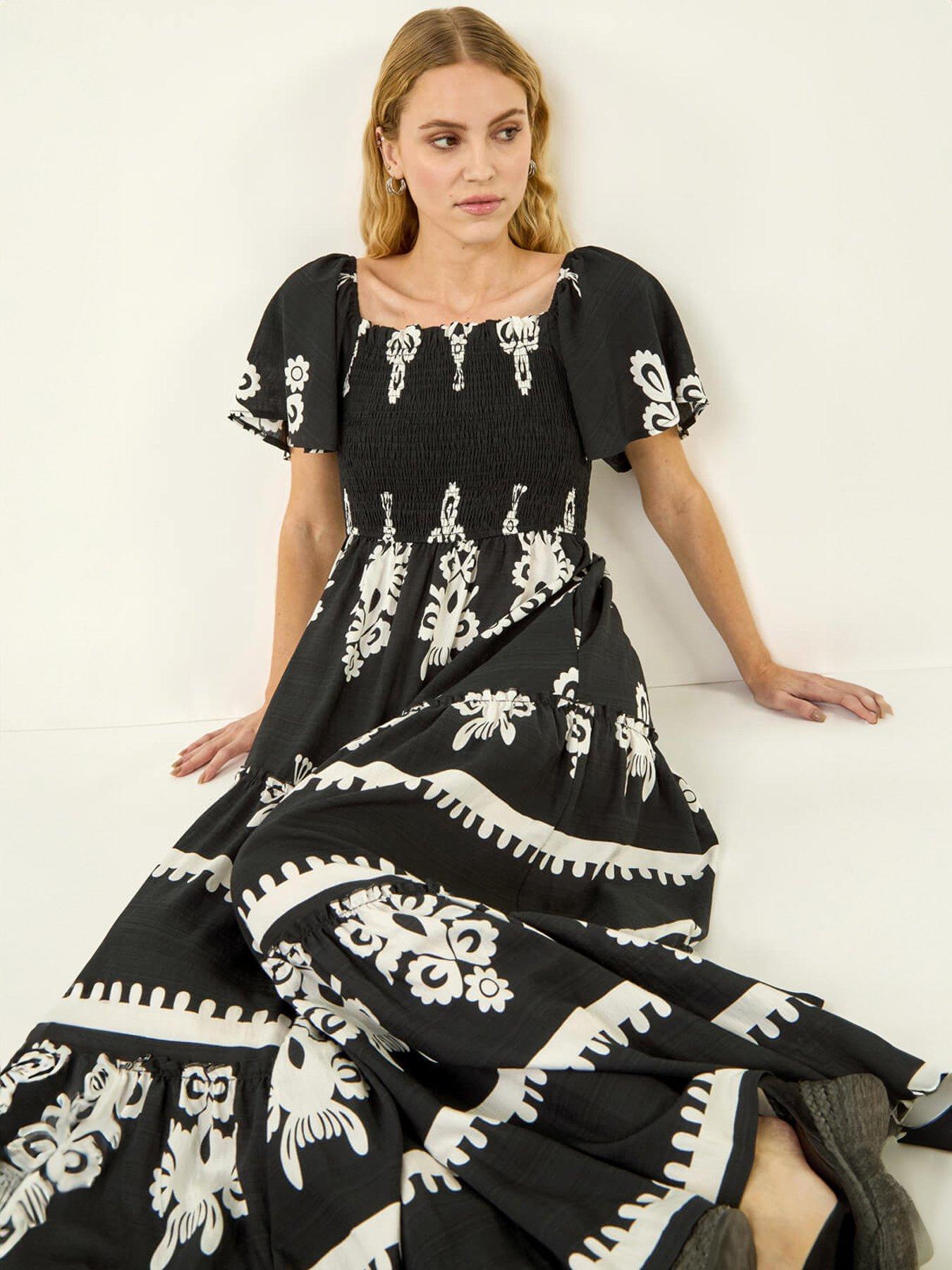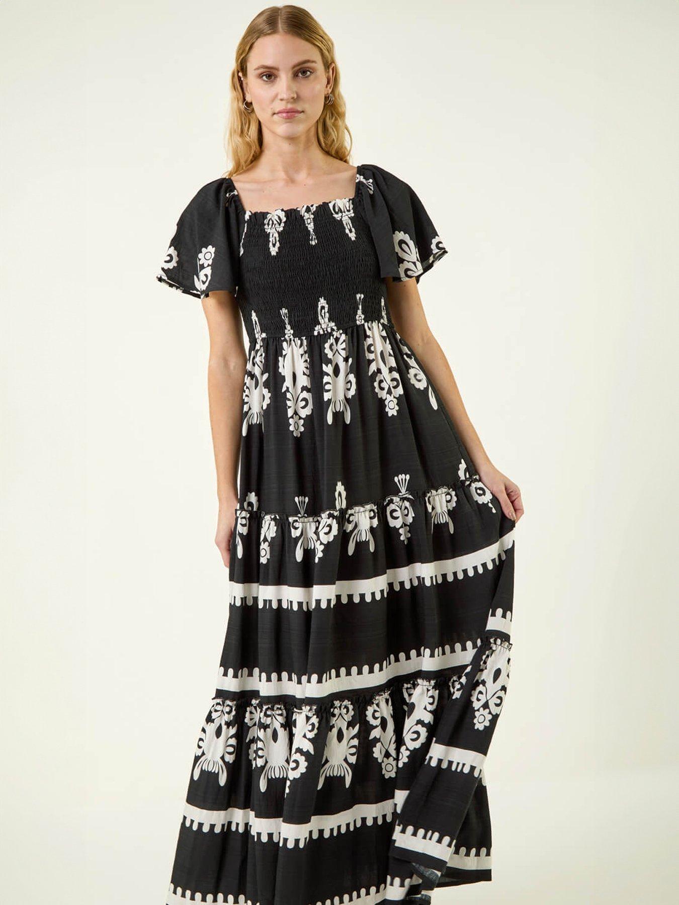 Roman Border Print Shirred Midi DressBe effortlessly chic in this stylish border print midi dress. The shirred bodice and square neckline add a touch of femininity while the short sleeves keep it cool and comfortable. The random border print gives it a unique twist perfect for the Spring/Summer season. Complete the look with sandals and a denim jacket for a casual yet fashionable ensemble!