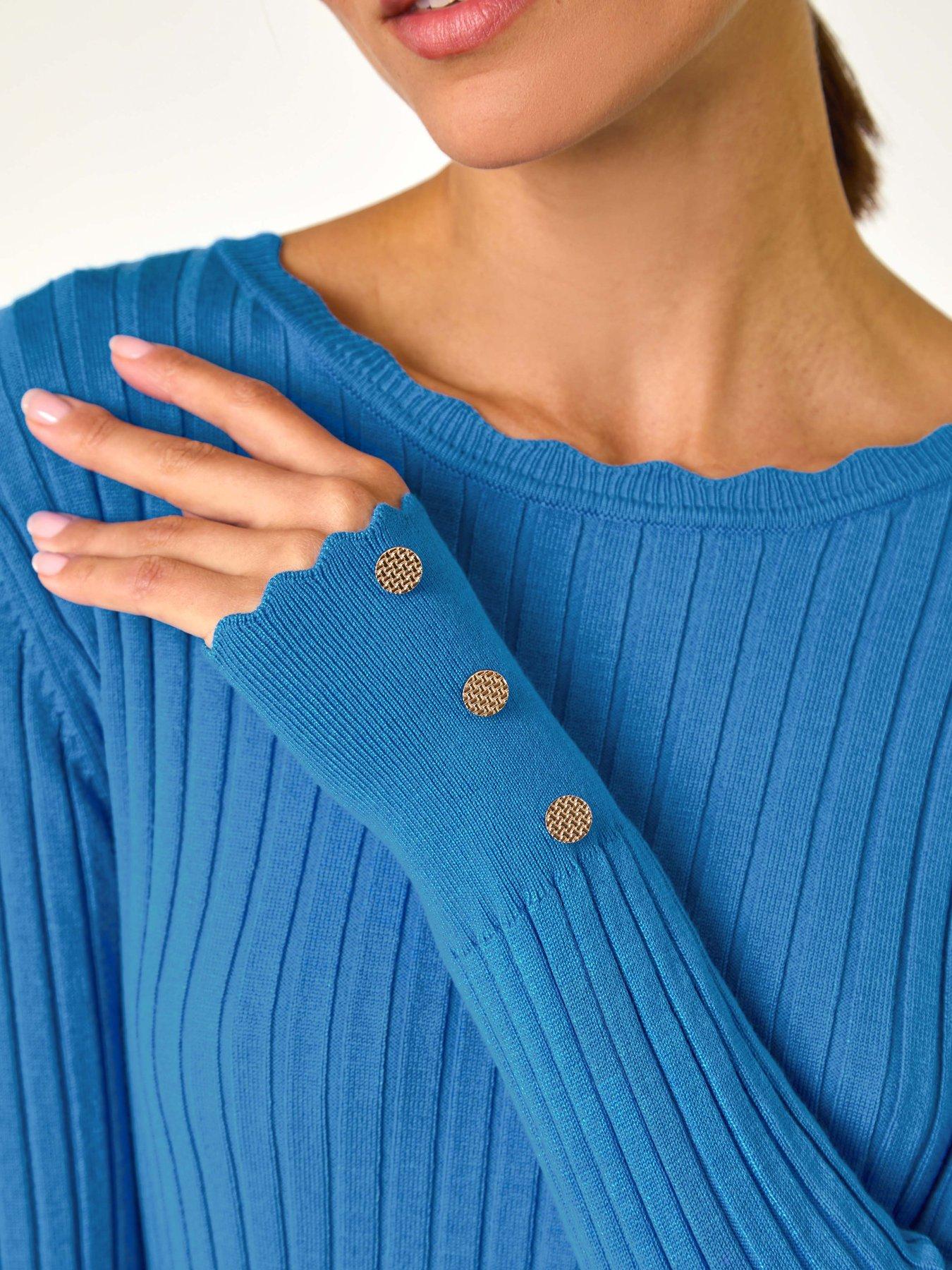 Roman Button Detail Ribbed Longline Jumper - DenimAdd a touch of sophistication to your knitwear collection with this comfortable ribbed texture jumper. Made from a soft, ribbed knit fabric, this jumper features a flattering longline fit, cosy full-length sleeves and an elegant round neckline. This stretchy style is accentuated by button details at the cuffs and feminine scalloped edges. For a versatile everyday look, pair it with trousers and boots or dress it up for an evening dinner date with leather trousers and heels.