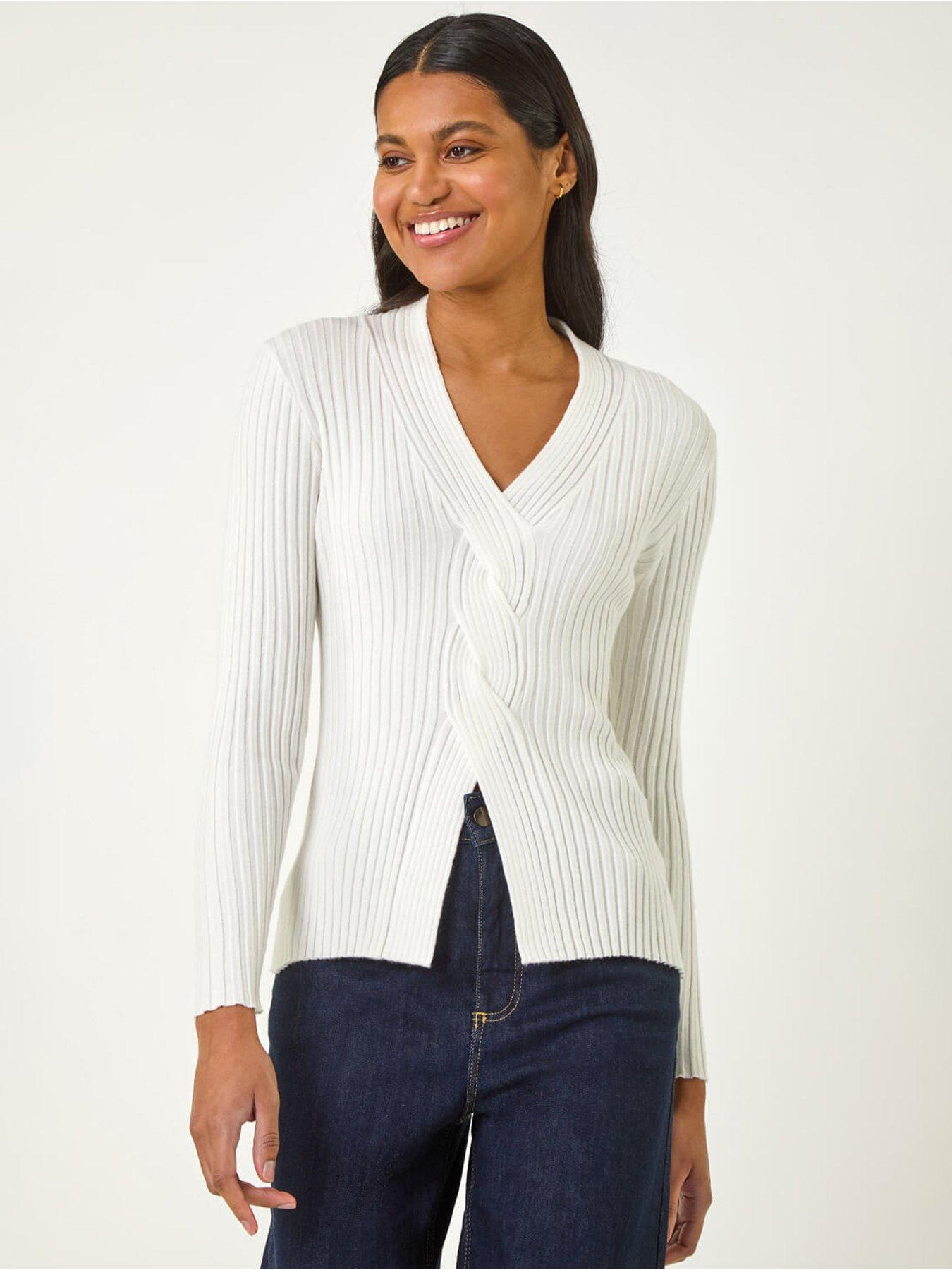 Roman Cable Split Detail Rib Jumper - IvoryStay cosy and stylish this Autumn/Winter with this cable rib knit jumper. Crafted with a flattering V-neck long sleeves and a unique split detail at the front this jumper is perfect for adding some texture to your outfit. Pair with your favourite jeans and trainers for a casual yet classic look that will keep you warm and on-trend all season long!