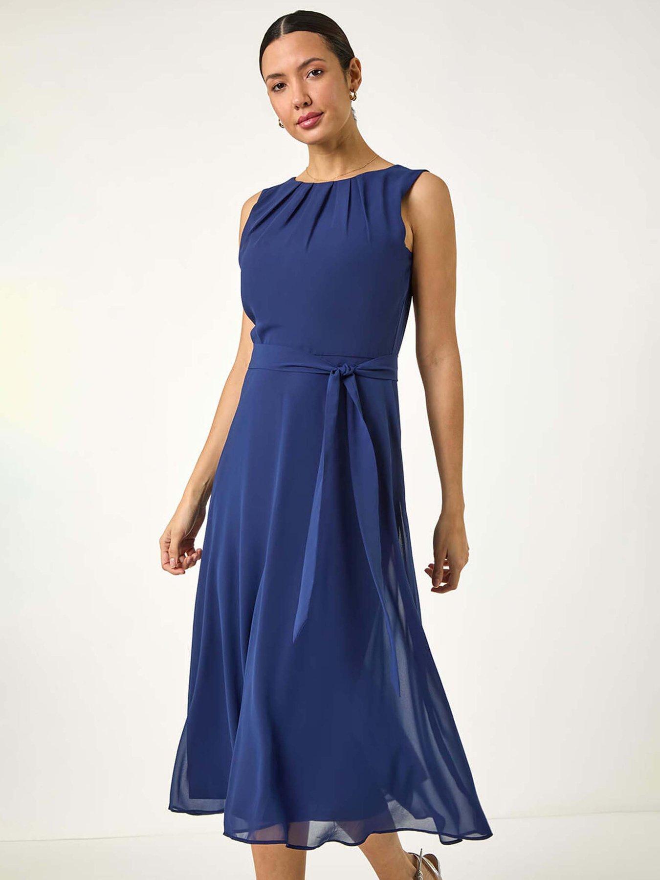 Roman Chiffon Pleated Neck Midi Dress - NavyElevate your look with this elegant chiffon midi dress. The classic round neckline and sleeveless style are perfect for warmer days crafted from a comfortable woven chiffon fabric. This dress falls beautifully at midi length with pleated detailing for added charm. Complete the look with the self-tie belt for a flattering silhouette and style with strapped heels and a trendy bolero for a polished outfit!