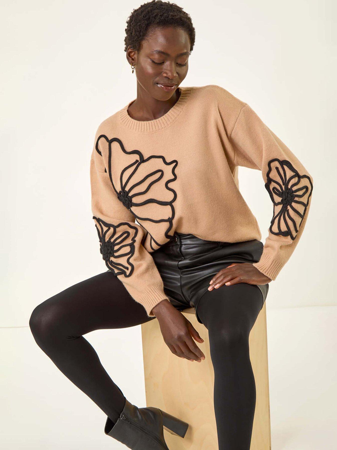 Roman Cornelli Rose Knit Jumper - CamelAdd a touch of elegance to your Autumn/Winter wardrobe with this floral design knit. The intricate Cornelli rose detailing gives a romantic touch to this piece while the soft hand feel ensures ultimate comfort. With long sleeves a classic crew neck and a relaxed fit this knit is perfect for both casual and elevated looks. Pair it effortlessly with jeans and ankle boots for a stylish and cosy outfit this season!