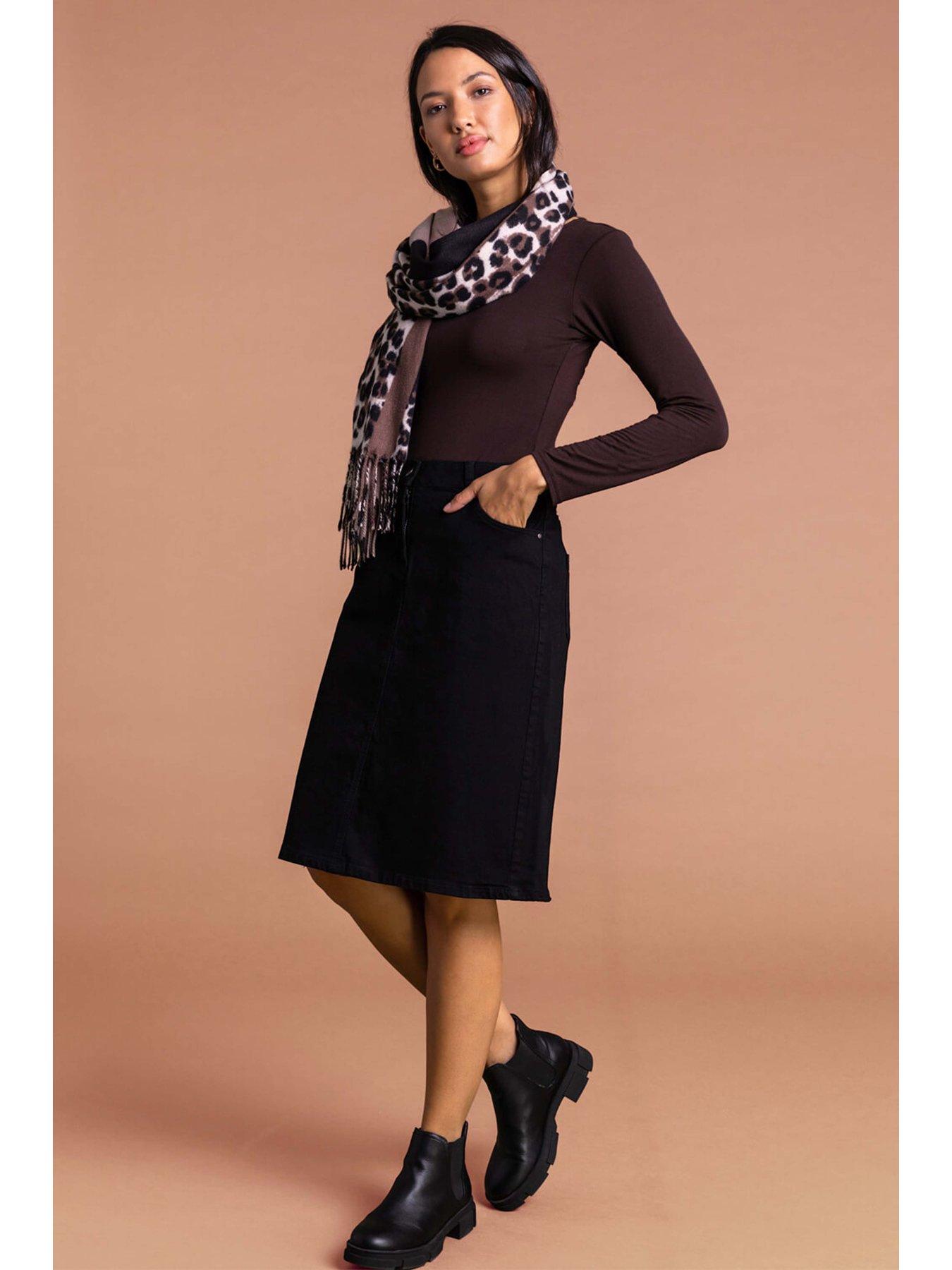 Roman Cotton Denim Stretch A Line Skirt - BlackAdd some fun denim to your Spring collection with this cotton denim skirt. Cut from a cool and comfortable, cotton denim fabric, this skirt has a slight stretch for a flattering and smooth fit. Secured with a zip fly and button fastening, this skirt features functional belt loops and practical back patch pockets. Pair with printed bardot tops for fun Summer style or add a bodysuit, longline lightweight cardigan and trainers for a day of sightseeing!Material & Care