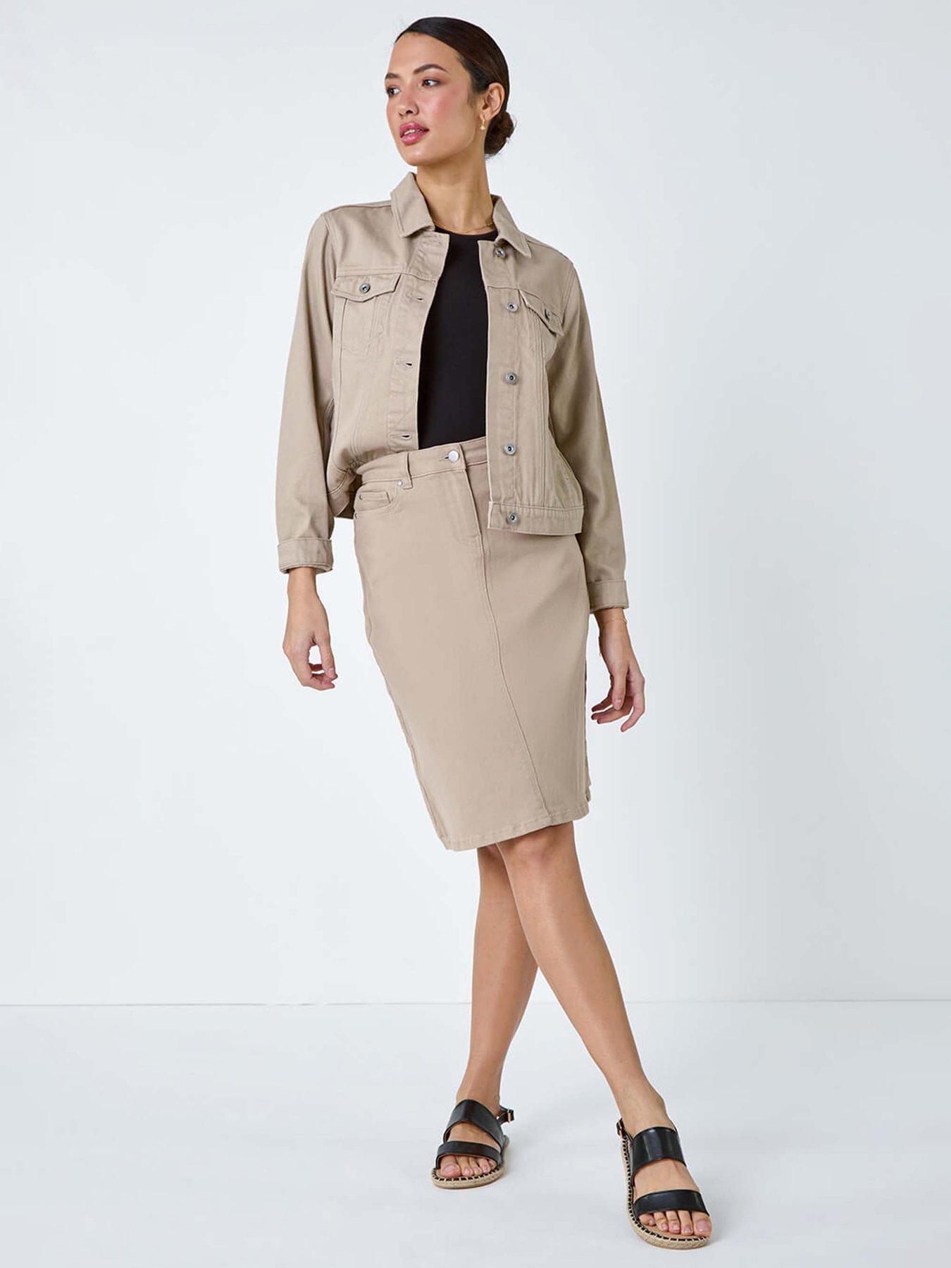 Roman Cotton Denim Stretch A Line SkirtAdd some fun colourful denim to your Spring collection with this cotton denim skirt. Cut from a cool and comfortable, cotton denim fabric, this skirt has a slight stretch for a flattering and smooth fit. Secured with a zip fly and button fastening, this skirt features functional belt loops and practical back patch pockets. Pair with printed bardot tops for fun Summer style or add a bodysuit, longline lightweight cardigan and trainers for a day of sightseeing!