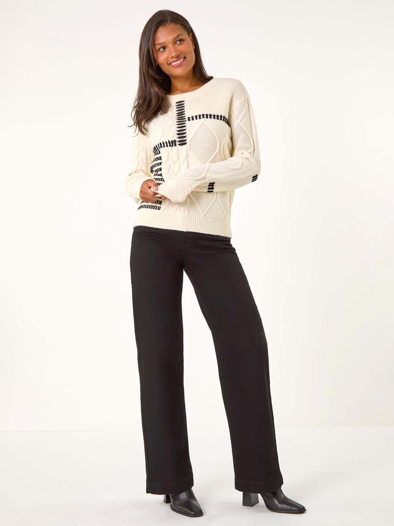 Roman Crew Neck Blanket Cable Knit Jumper - IvoryWrap yourself in warmth this Autumn Winter with our stylish blanket cable knit jumper. Crafted from a mix of soft knit fabrics, this jumper features a classic crew neckline and trendy long drop shoulder sleeves. The unique blanket stitch detail adds a touch of charm to your seasonal wardrobe, making it a must-have piece for the cooler months. Pair with jeggings and ankle boots for a trendy look!