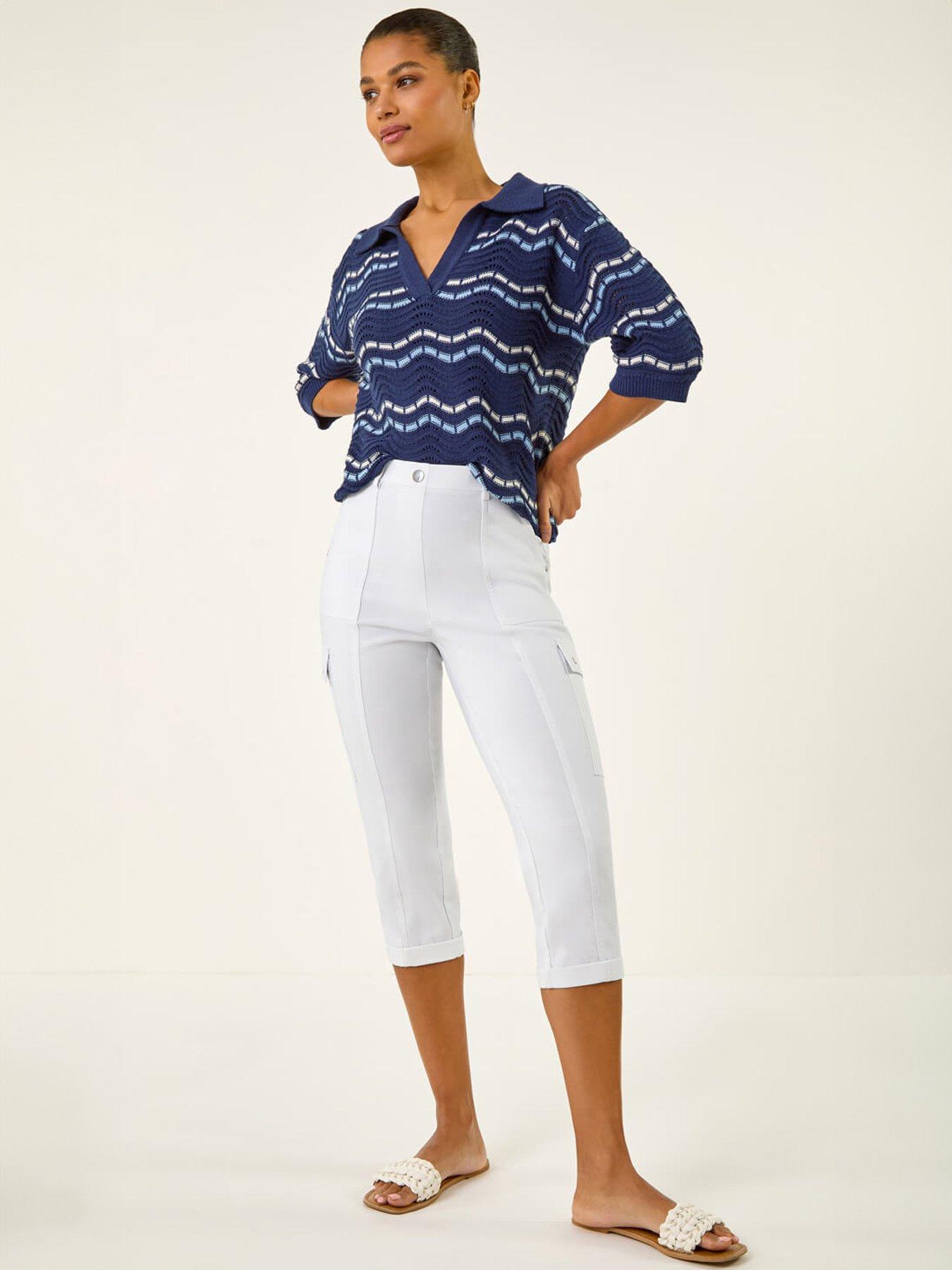 Roman Cropped Cargo Stretch TrouserAdd a touch of effortless chic to your casual wardrobe with these stylish tailored bengaline trousers. Featuring a trendy crop cargo style and a unique front seam detail, these trousers are perfect for the warmer months. Made from durable bengaline fabric, they offer both style and comfort. Pair with a pretty cami top and sandals for a laid-back, summery look that will take you from day to night with ease!