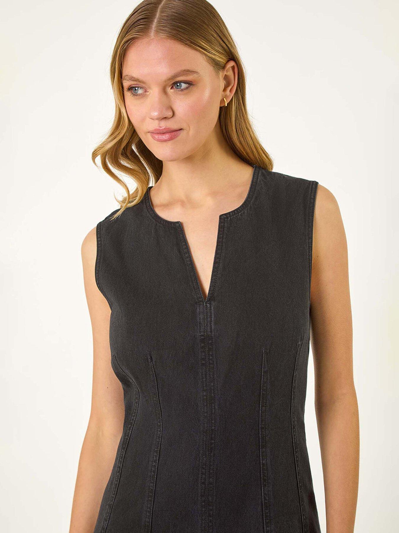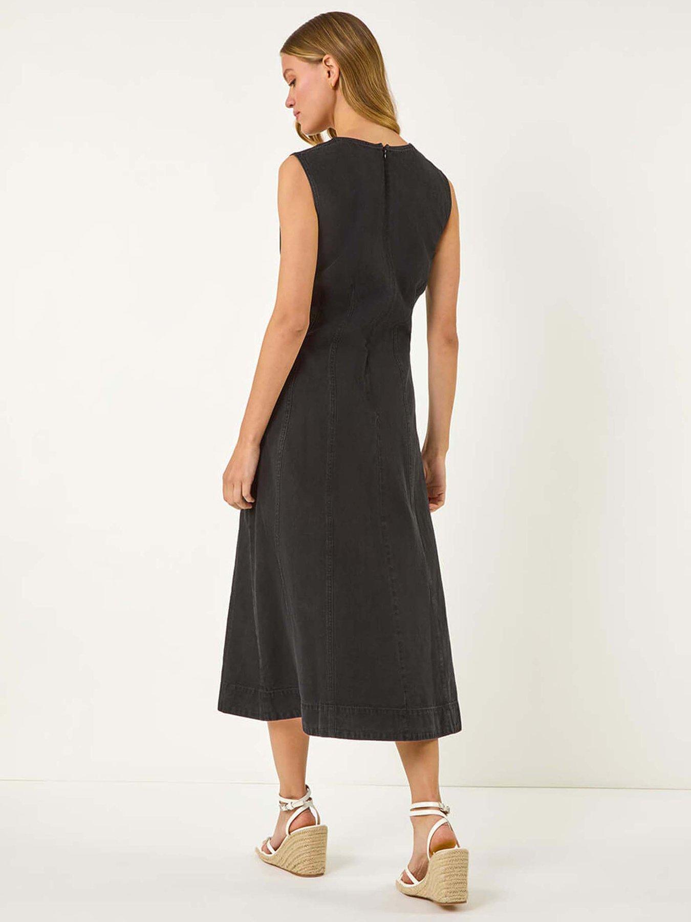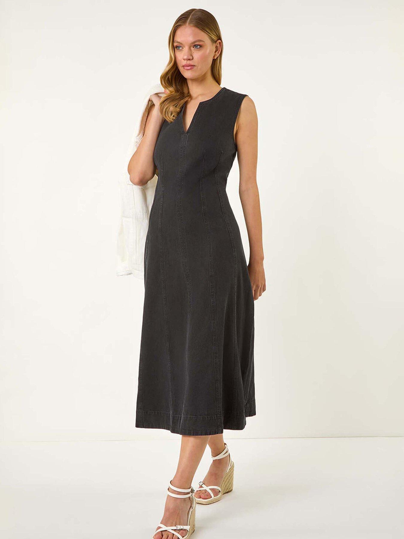 Roman Denim Panel Detail Midi Dress - BlackFloat effortlessly through the warmer days in this chic panel detail midi dress. Embracing the Spring/Summer vibes this midi dress features a flattering v-neck and sleeveless design in a fit and flare shape. The panel detailing adds a touch of elegance to the overall look. Simply pair it with sandals and sunglasses for a relaxed and stylish ensemble.