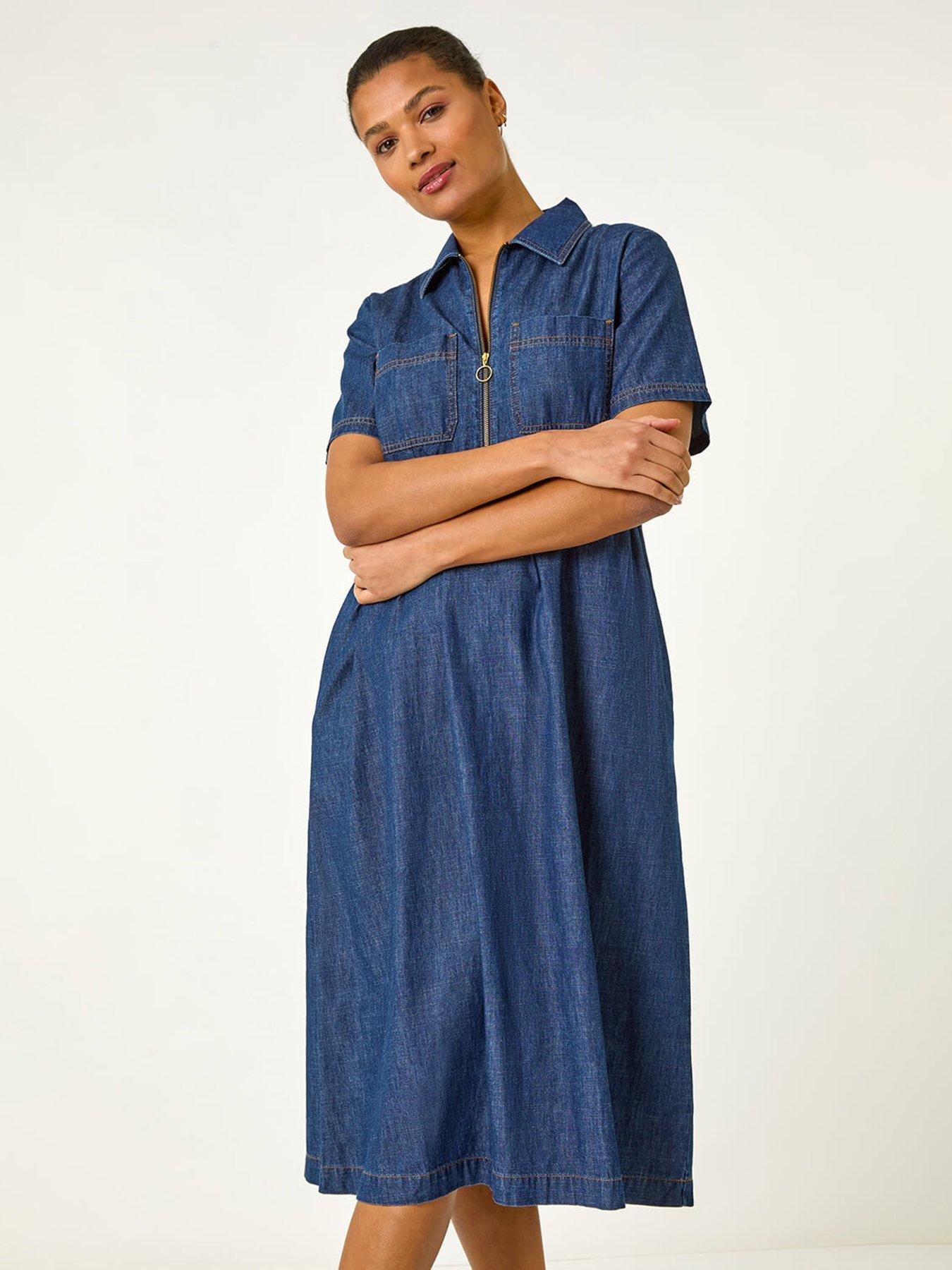 Roman Denim Zip Midi Dress - BlueThis denim midi dress is a perfect blend of casual and chic. Featuring a collared V-neck and trendy zip detail, it?s designed in a relaxed smock shape with long sleeves for versatile styling. Ideal for all-day wear, pair it with sandals for a comfortable yet effortlessly stylish look!