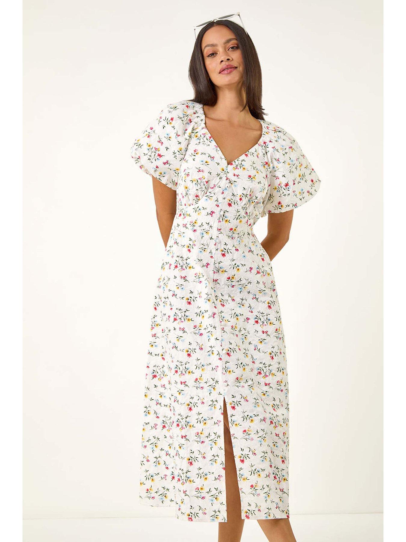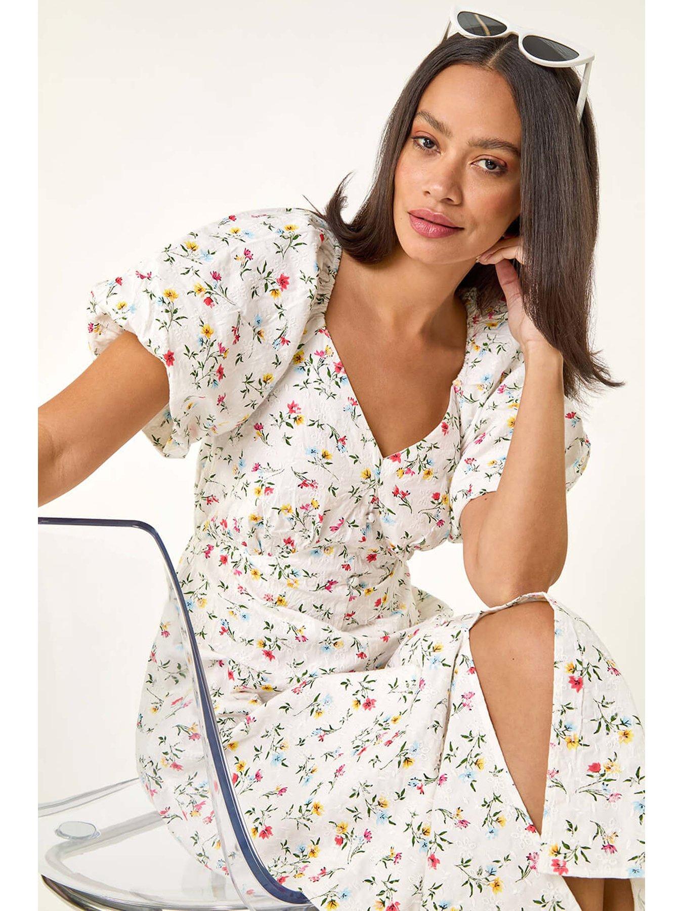 Roman Dusk Ditsy Broderie Midi Dress - WhiteStep into the sunshine with this stunning ditsy broderie dress perfect for Spring/Summer. The dress features a flattering V-neck and gathers at the bust creating a beautiful fit and flare silhouette. Designed in a comfortably woven fabric this dress is ideal for all-day wear. With short sleeves and a pull-on style it's a hassle-free option for any occasion. Complete your look with a pair of sandals and a denim jacket for an effortlessly chic ensemble!