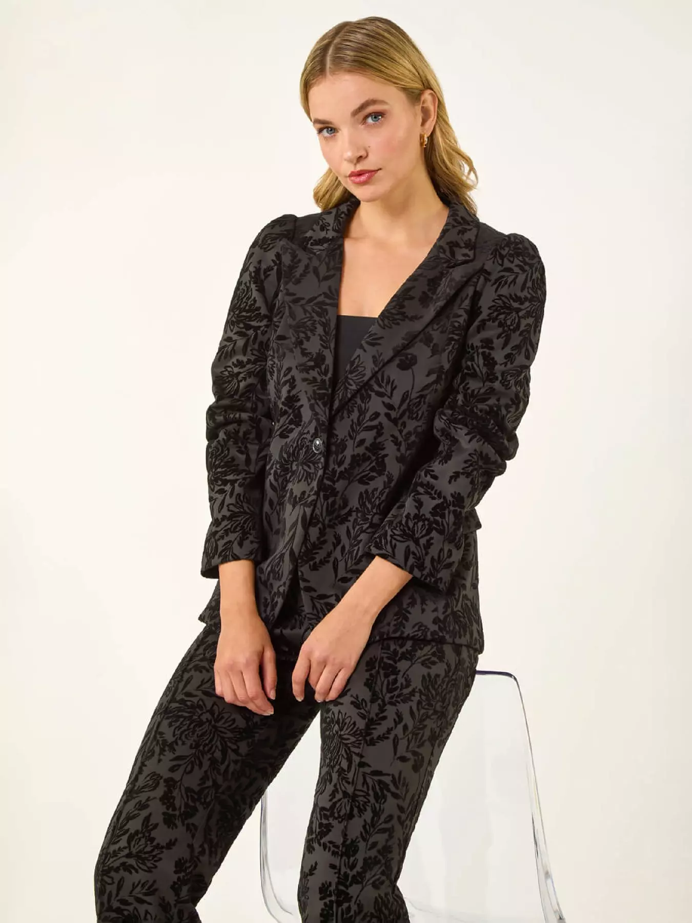 Make a fashion statement this Autumn/Winter season with this stunning floral flocked blazer. Featuring a unique floral pattern this hip-length blazer boasts a full opening and practical pockets on the horizontal seam. Perfect for layering over a dress and heels for a chic and sophisticated look that will turn heads wherever you go!- Material Content: 92% Polyester 8% Elastane Lining: 100% Polyester