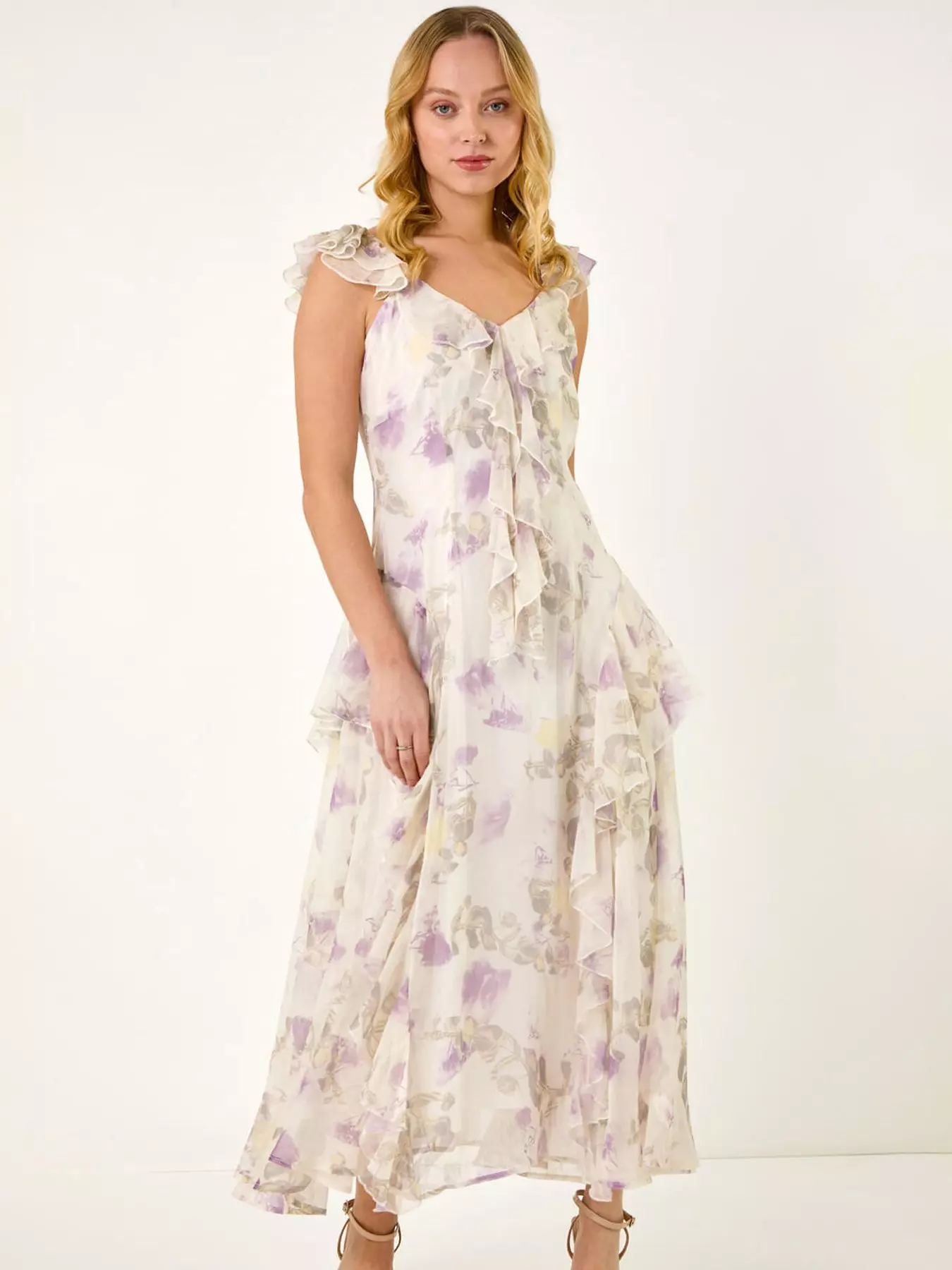 E.A.N: 5 0 6 3 5 6 6 1 7 0 4 3 8Roman Dusk Floral Print Ruffle Maxi Dress - White