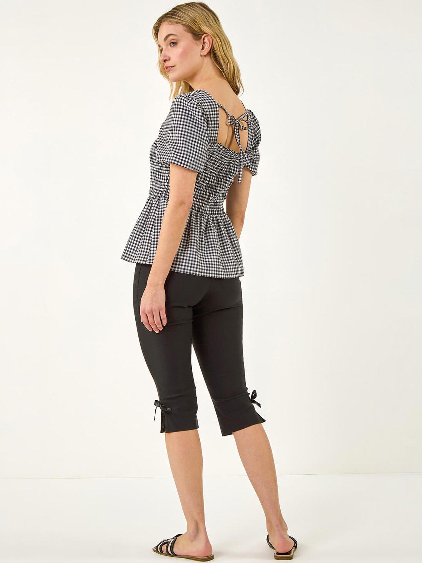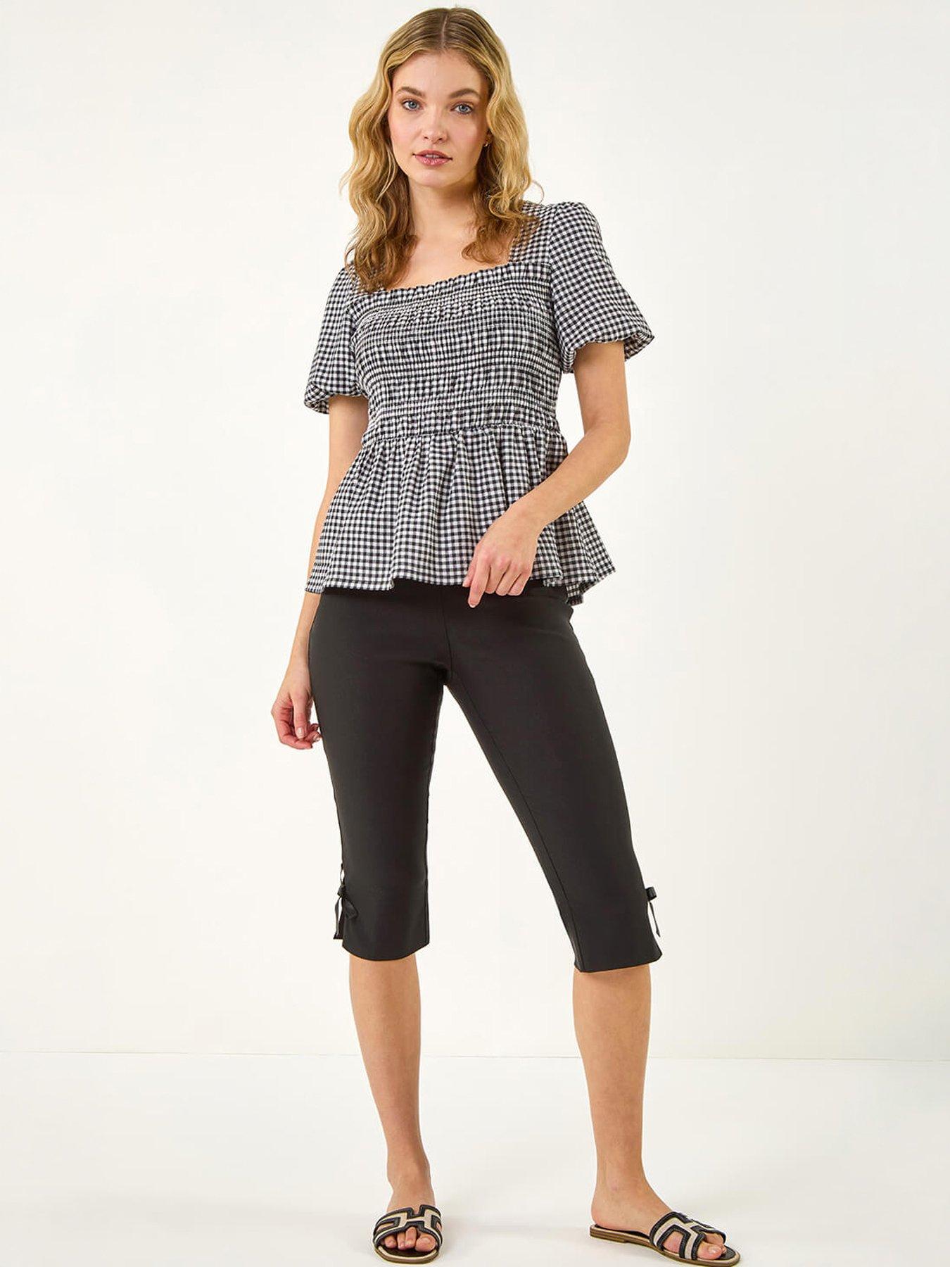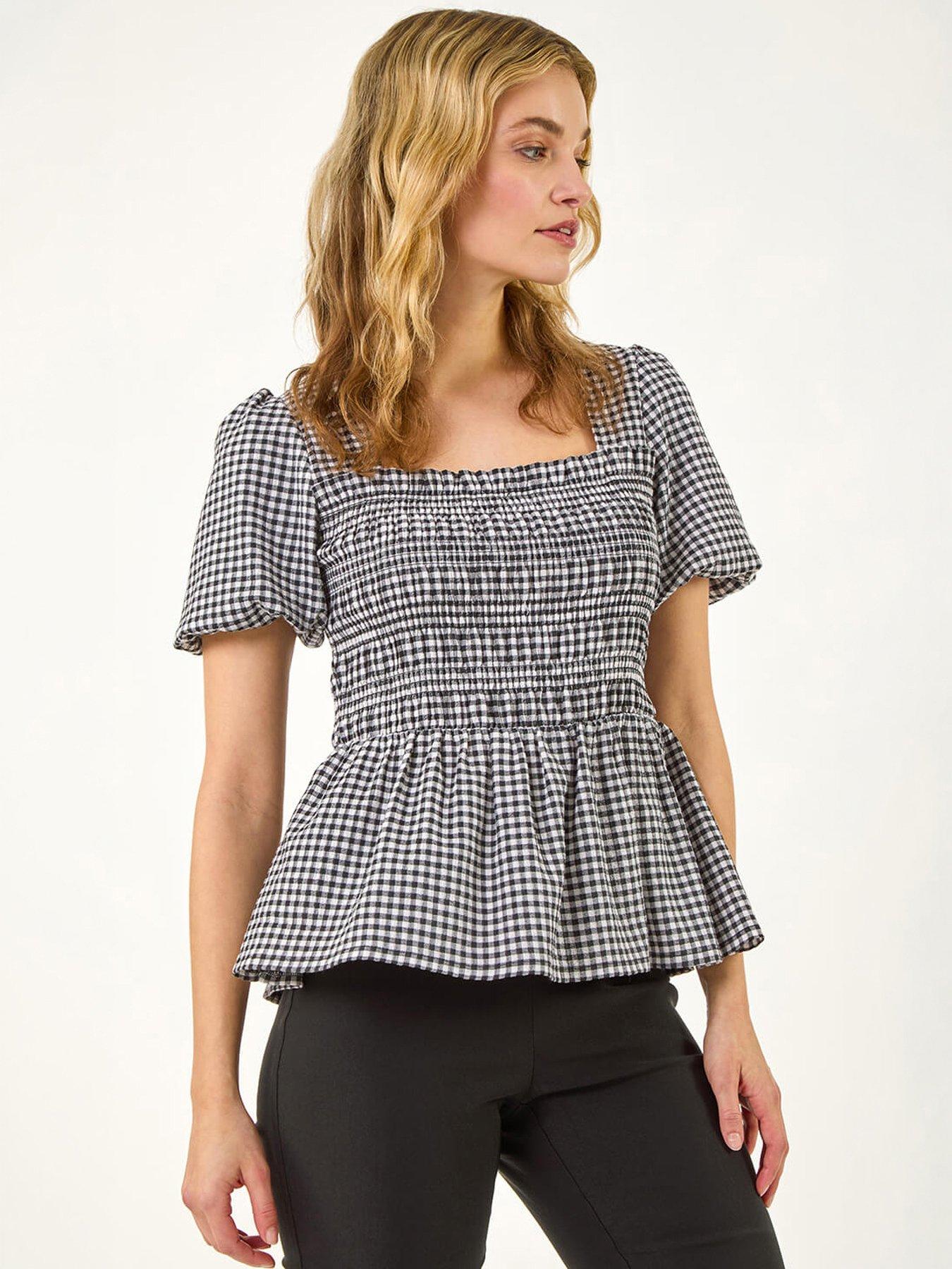 Roman Dusk Gingham Shirred Peplum TopGet ready for picnics and garden parties with this charming Dusk gingham shirred top. The shirred bodice creates a flattering fit while the short puff sleeves add a touch of femininity. The peplum look adds a fun and flirty vibe perfect for sunny days out. Embrace the gingham print trend and style this top with a denim jacket and jeggings for a complete Spring Summer look!