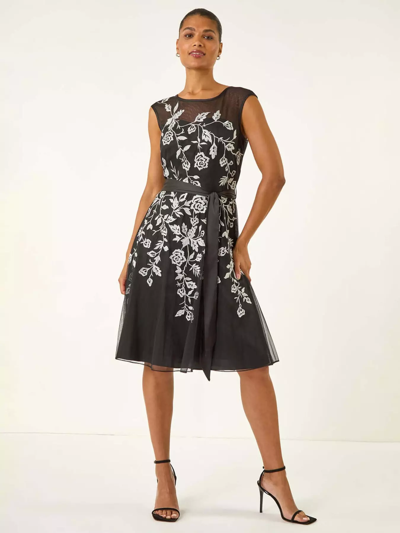 Embrace the enchanting beauty of the season with this stunning silver and black embroidered dress. With delicate floral embroidery a flattering tie waist and elegant mesh detail this midi length dress is perfect for special occasions. The short sleeves add a touch of sophistication to this exquisite piece. Complete your look with sleek strappy heels and a chic blazer for a perfectly polished ensemble.- Material Content: 100% Polyester Contrast Fabric: 98% Polyester 2% Metallised Fibre Lining: 95% Polyester 5% Elastane