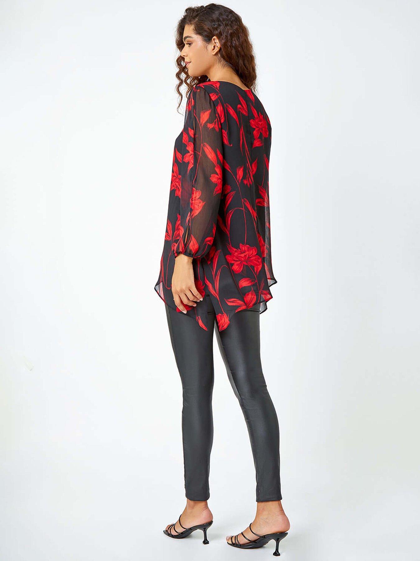 Roman Floral Chiffon Layered Tunic Top - RedUpdate your smart wardrobe with this pretty printed top. An all-over floral print adorns this tunic top to create a vibrant addition to your seasonal wardrobe. Combining a modest round neckline, long chiffon sleeves with elasticated cuffs and a luxurious layered hem. Fabulous and floaty, this style has elegant split details on the sleeves that are great for evening dressing. Wear with smart separates and black courts for a glam desk to dinner staple this Autumn Winter.Material & Care