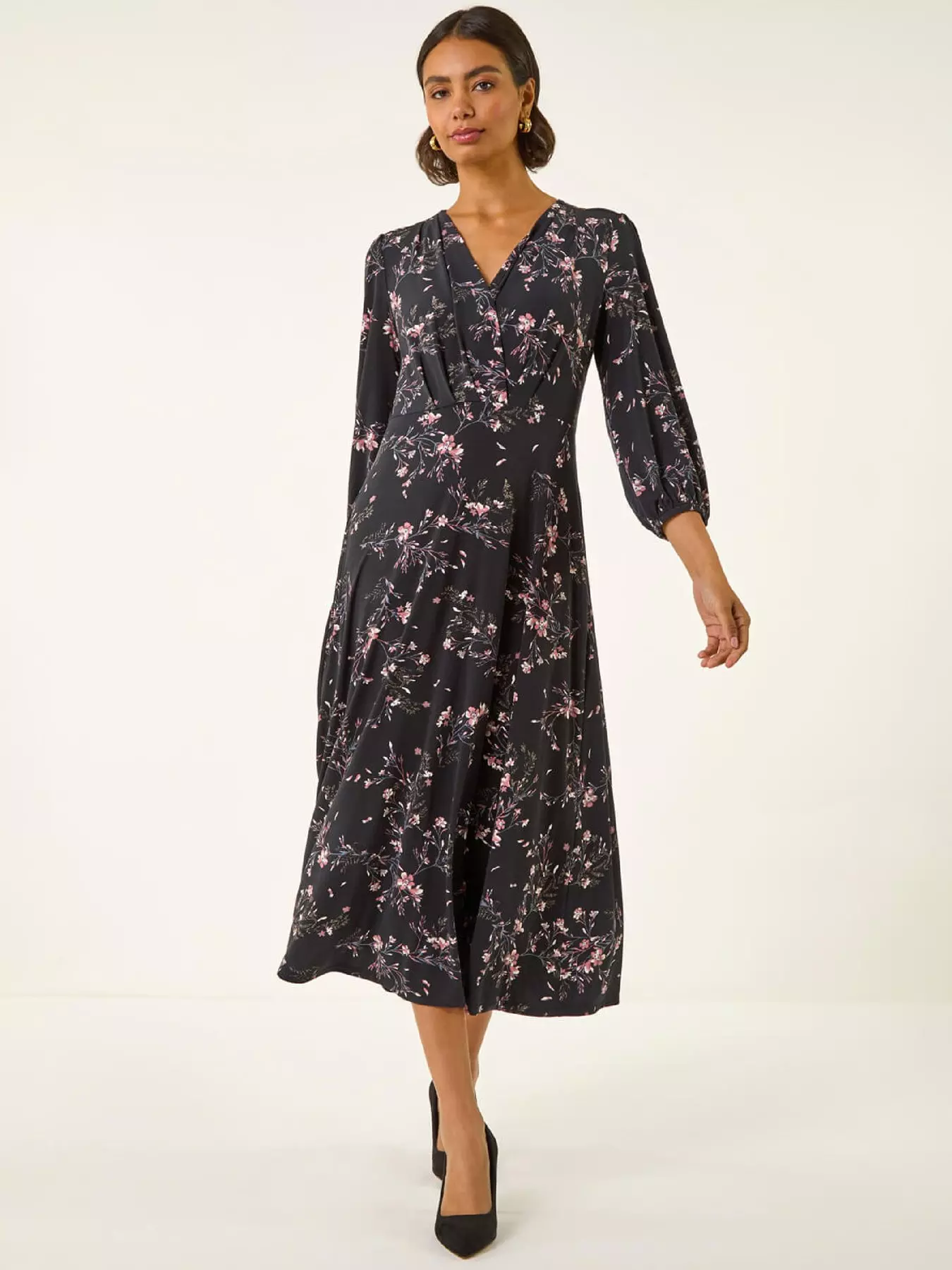 Make a statement this Autumn Winter with this charming floral print midi dress. Featuring elegant 3/4 sleeves and a flattering v-neckline this dress is designed to perfection. Cut from a stretch jersey fabric this dress skims the body beautifully finishing at a classy midi length. Complete your stunning fall look by pairing it with a denim jacket and ankle boots!- Material Content: 94% Polyester 6% Elastane