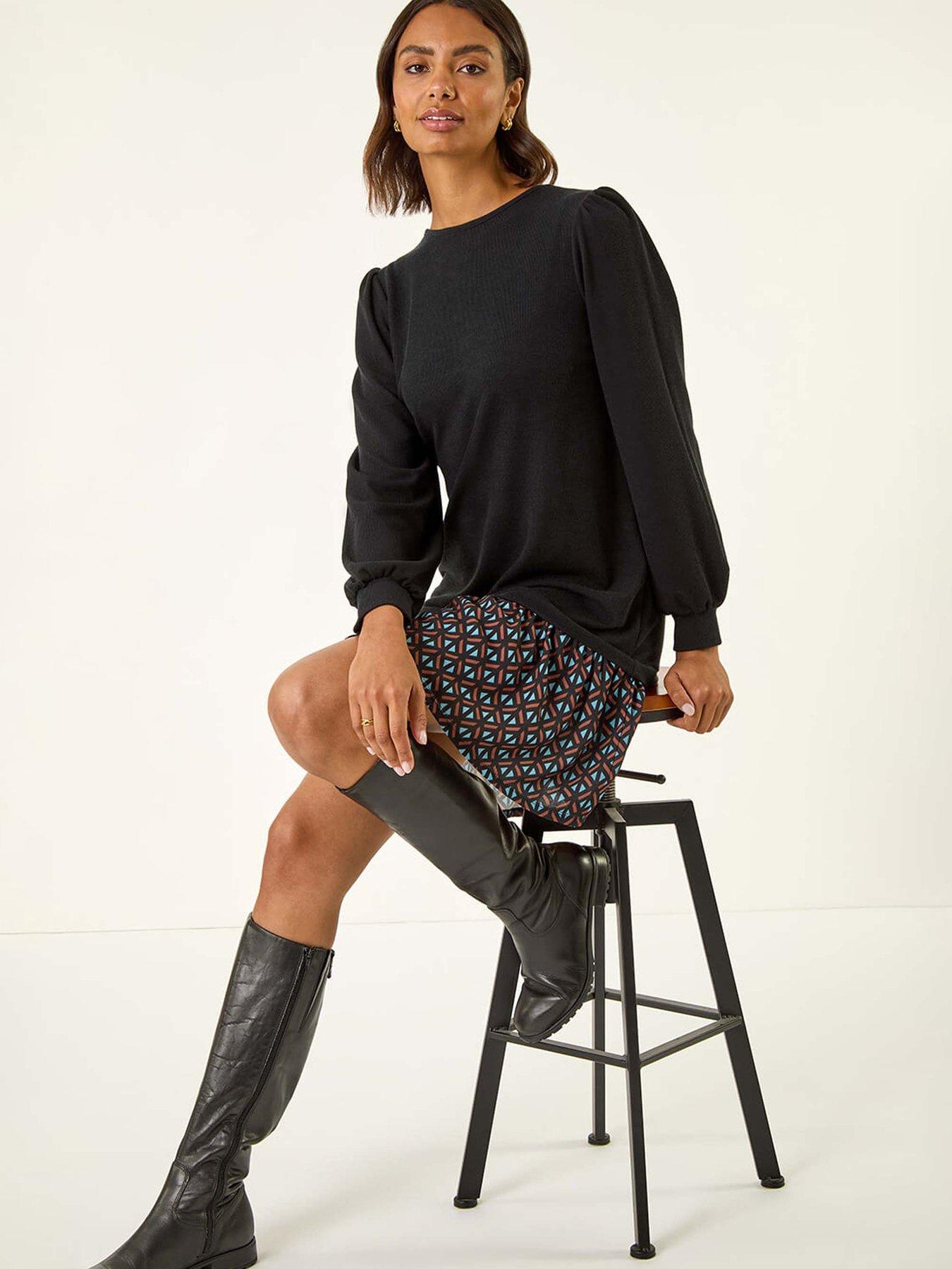Roman Geometric Mix Print Mini Dress - BlackAdd a playful pop of print to your wardrobe with this geometric print mini dress. Designed with a flattering round neckline and long sleeves this dress features a contrasting printed frill skirt that adds movement and charm. The swing silhouette offers a relaxed yet stylish fit making it perfect for all-day comfort with a touch of flair. Falling above the knee it's a versatile piece you can dress up or down style with tights and ankle boots for a chic layered Autumn look.