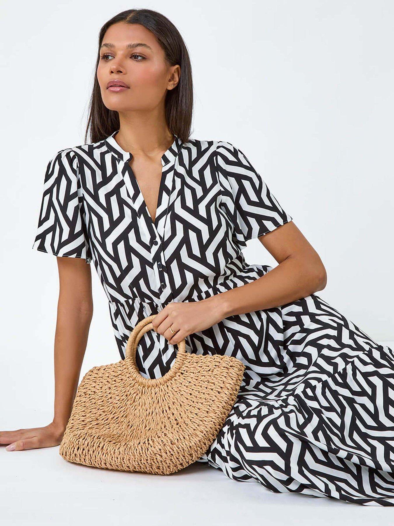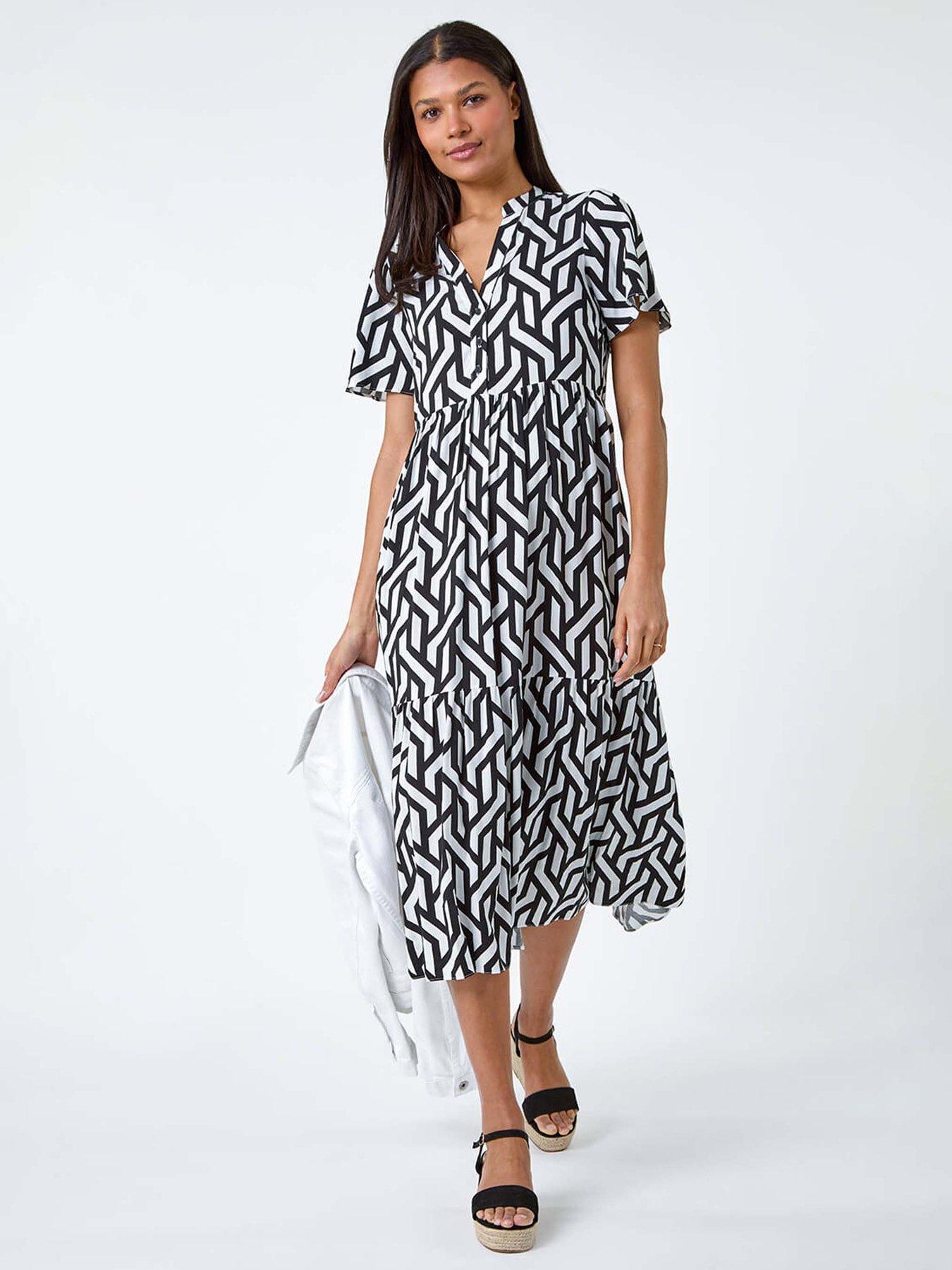 Roman Geometric Print Tiered Midi DressFeel fabulous in this statement geometric print midi dress this season. Showcasing a stylish v-neckline, short sleeves, and button detailing on the bodice, this tie waist dress boasts a charming frilled and tiered skirt for added flair. Crafted from a light woven material in a flattering midi length, it offers a perfect choice for your Spring casual days. Complete the look with heeled wedges and a denim jacket for effortless daywear at home or on holiday this Summer!