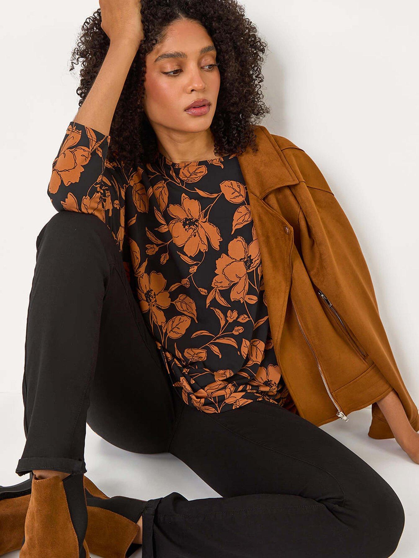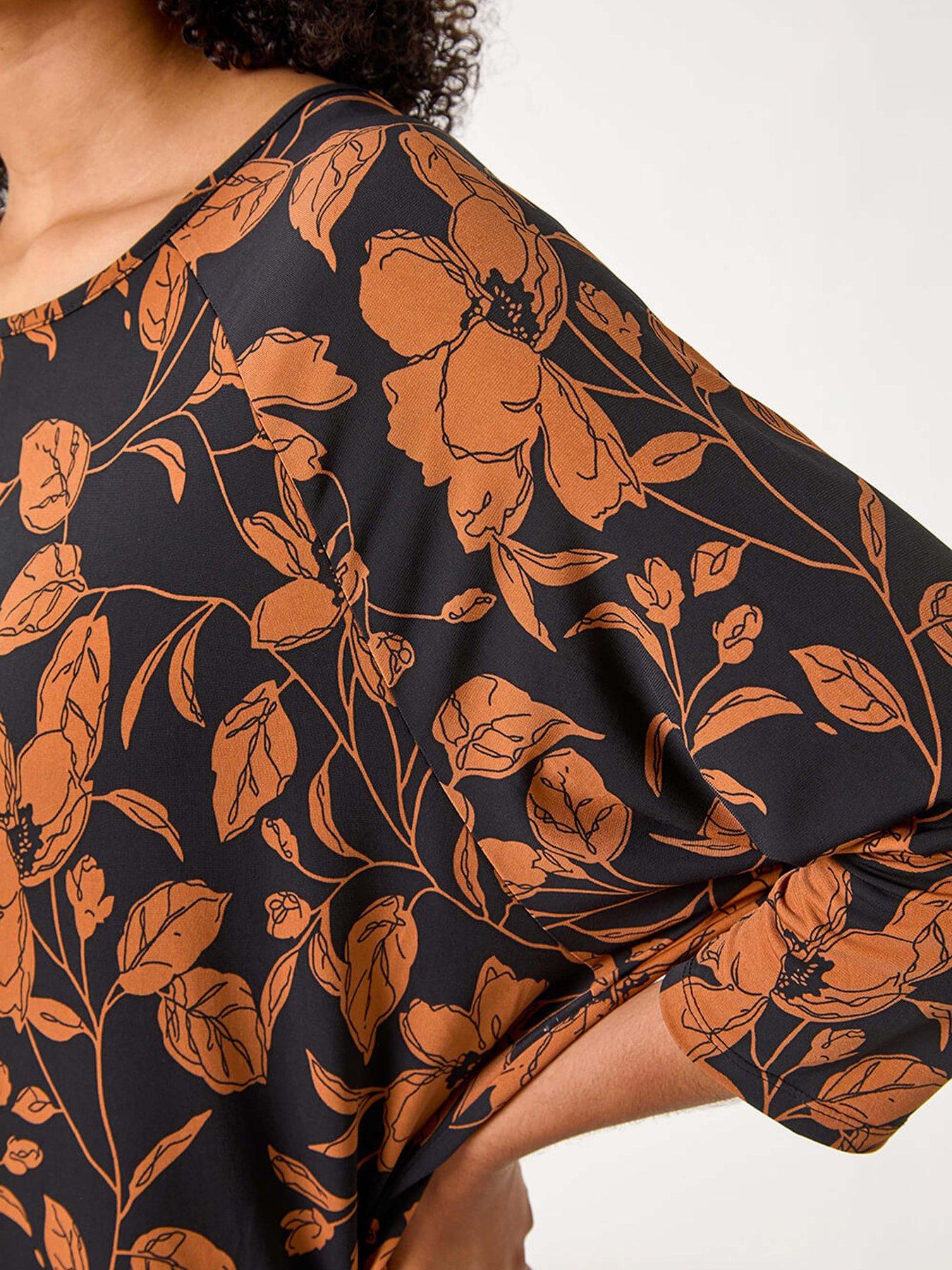 Roman Leaf Print Raglan Sleeve Stretch Top - TanEmbrace the fall season with our leaf print sleeve top. Cut from a stretch jersey fabric with a modest, round neckline, delicate floral print, and 3/4 raglan sleeves, this tee-shaped top is sure to keep you comfortable during the colder months. Wear with jeggings and boots for a casual Autumn Winter style!