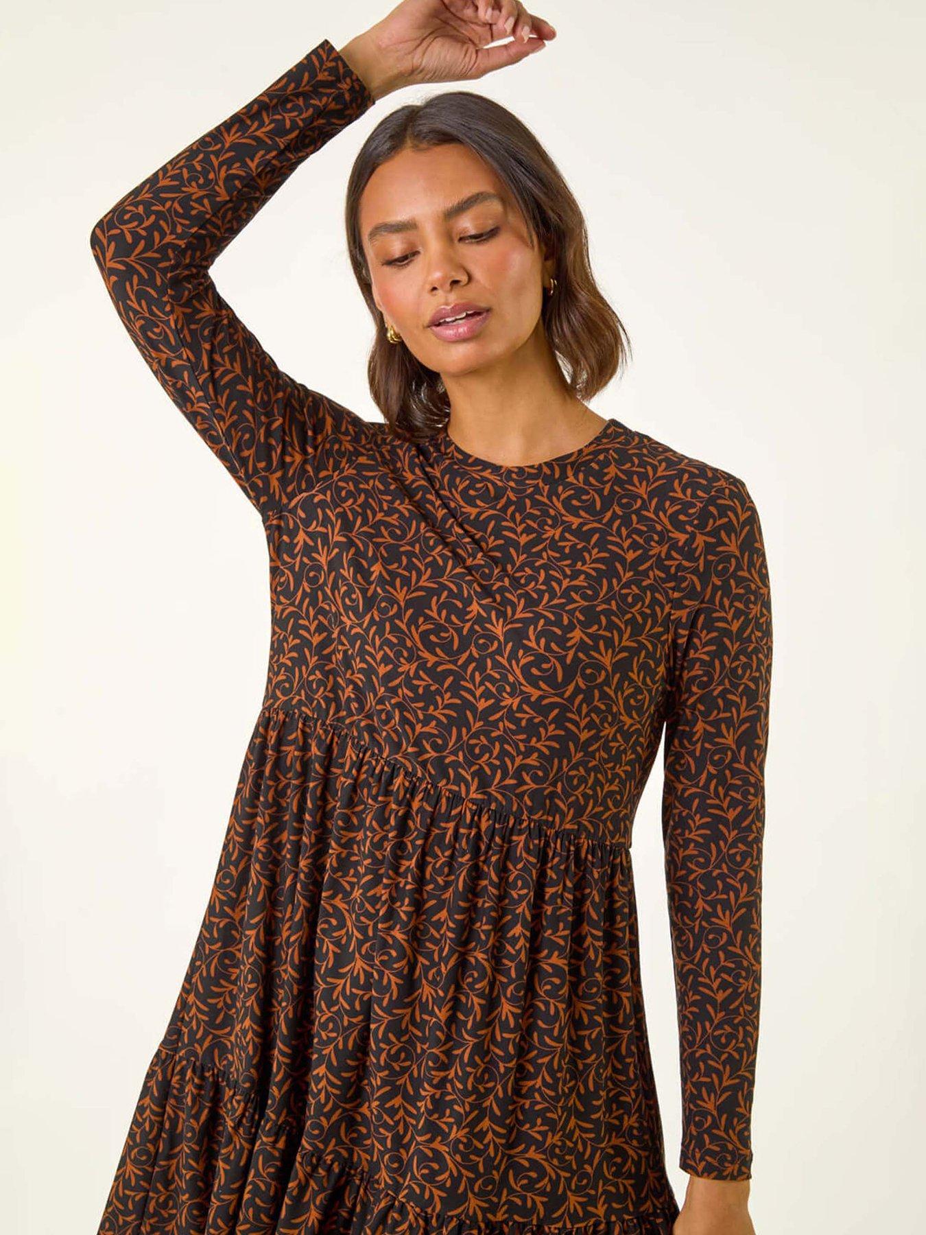 Roman Leaf Print Stretch Dress - RustMake a style statement this season in our leaf print stretch dress. This knee-length dress boasts a classic round neckline and long sleeves perfect for keeping you warm in style. Crafted from a smooth stretch jersey fabric with a vibrant tropical leaf print this dress is sure to turn heads wherever you go. Complete with a denim jacket and ankle boots for a stunning fall look!