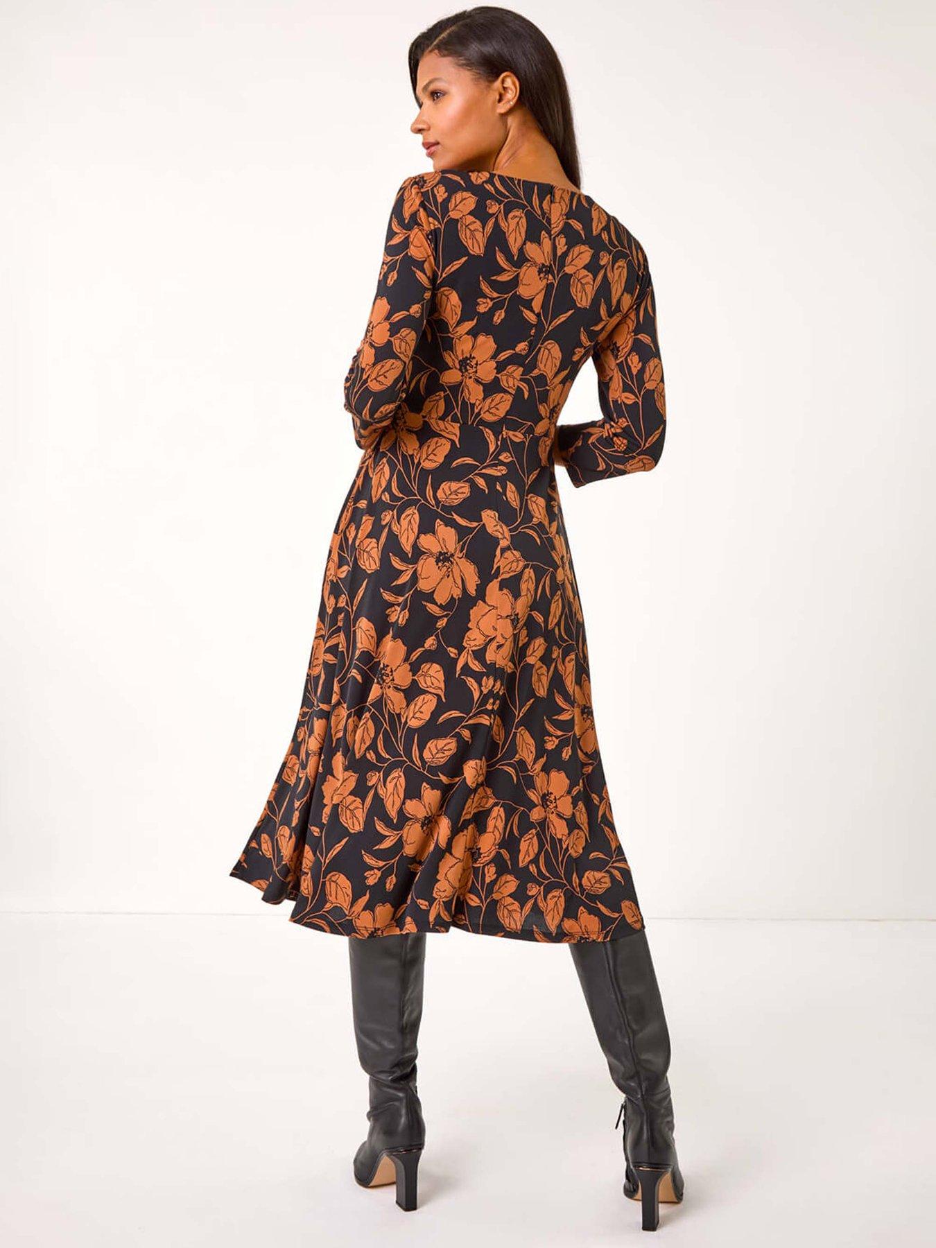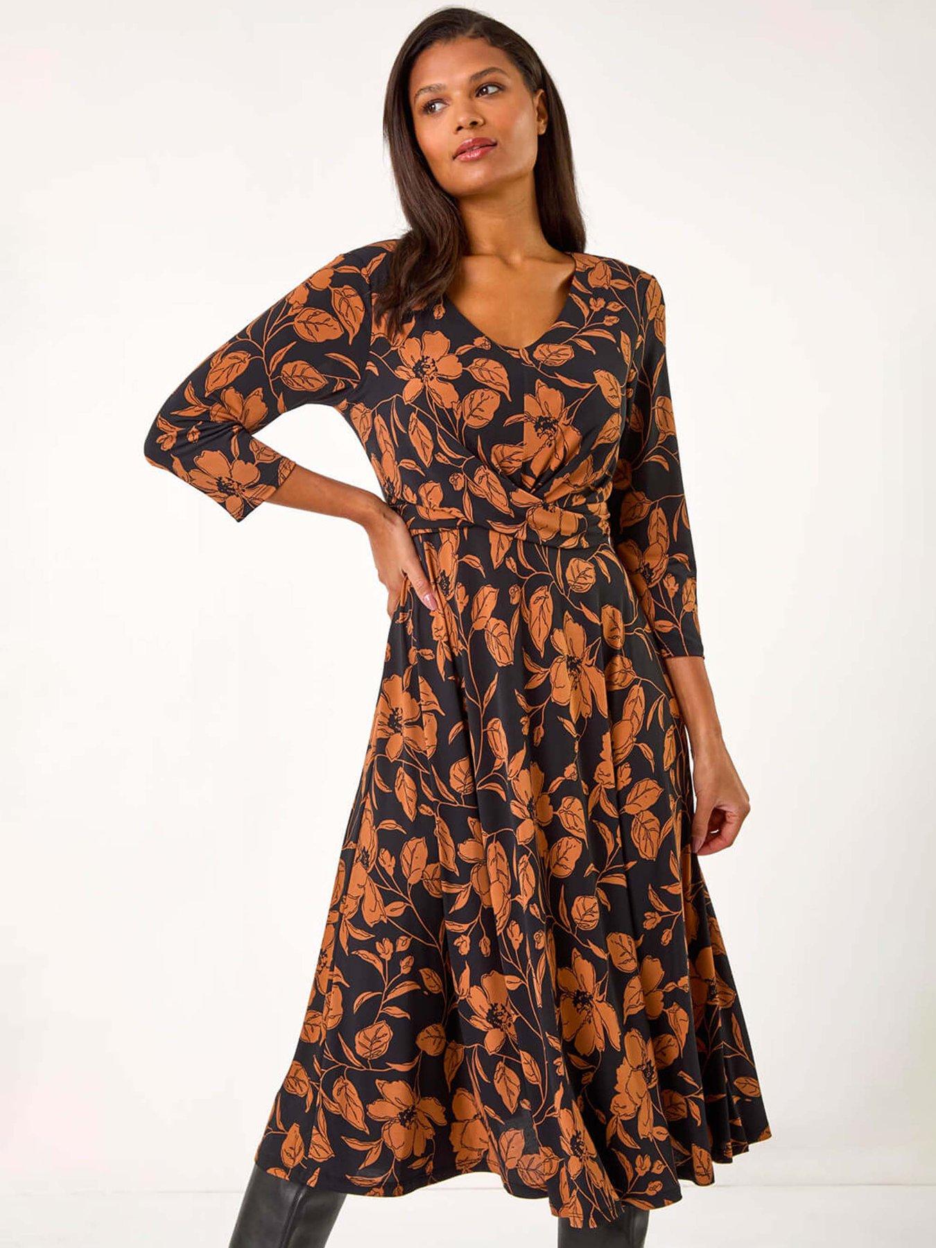 Roman Leaf Print Wrap Midi Dress - TanUpdate your Autumn/Winter wardrobe with this stunning leaf print midi dress. The wrap bodice with a flattering V-neckline creates an elegant silhouette while the 3/4 sleeves add a touch of sophistication. Cut in a fit and flare shape from comfortable stretch jersey this dress offers both style and comfort. Complete the look with tights and heeled boots for a chic ensemble that will take you from day to night effortlessly.