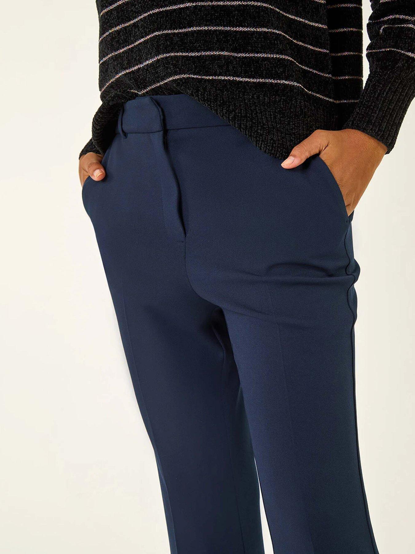 Roman Long Bootcut Stretch Trousers - NavyStep up your Autumn/Winter style game with these sleek bootcut leg trousers. Crafted from a premium stretch crepe fabric these trousers feature a flattering bootcut leg complete with belt loops and practical side pockets. The zip fly and button fastening ensure a secure fit while the versatile design allows you to pair them effortlessly with knitwear and boots for a chic and polished look.
