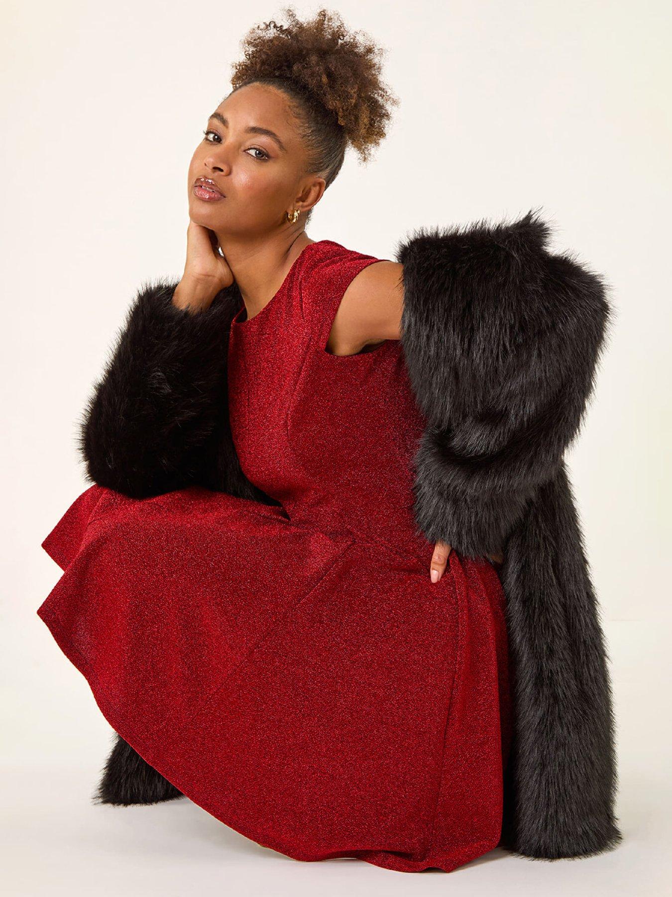 Roman Metallic Stretch Flare Dress - RedEnhance your evening attire with this metallic stretch dress that exudes sophistication. Designed with a flattering fit along with the round neckline and short cap sleeves create a timeless look. Finishing above the knee this dress is perfect for the Autumn Winter season. Complete your outfit with stylish strapped heels and a trendy bolero for an elegant appearance!