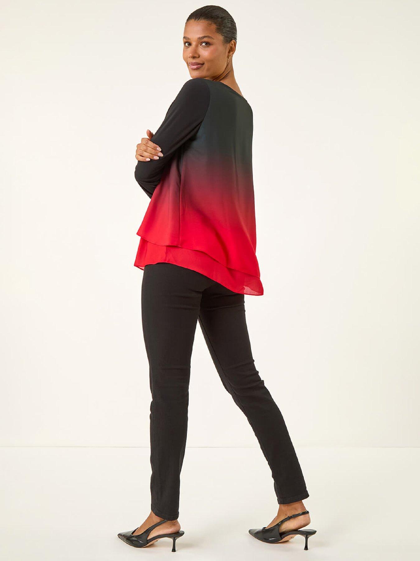 Roman Ombre Chiffon Overlay Top - RedAdd a touch of elegance to your Autumn/Winter wardrobe with this chic ombre overlay top. Featuring a stunning chiffon overlay with an all-over ombre print this stylish top has long sleeves and finishes at the low hip. The round neckline adds a classic tou