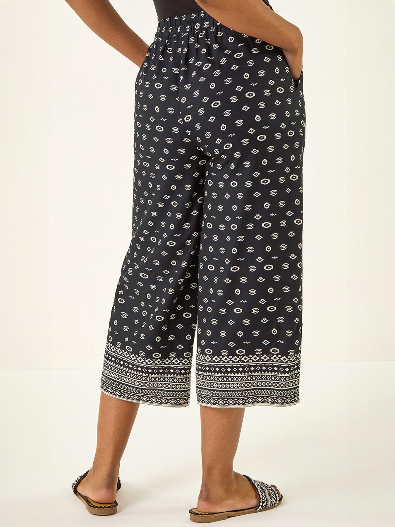 Roman Petite Border Print Cropped TrouserAdd a touch of elegance to your wardrobe with these Petite border print cropped trousers. Crafted from a comfortable woven fabric these trousers feature a stylish border print at the hem and an easy pull-on elasticated waist. The cropped length adds a contemporary touch to these versatile trousers. Simply pair them with a blouse and jacket!