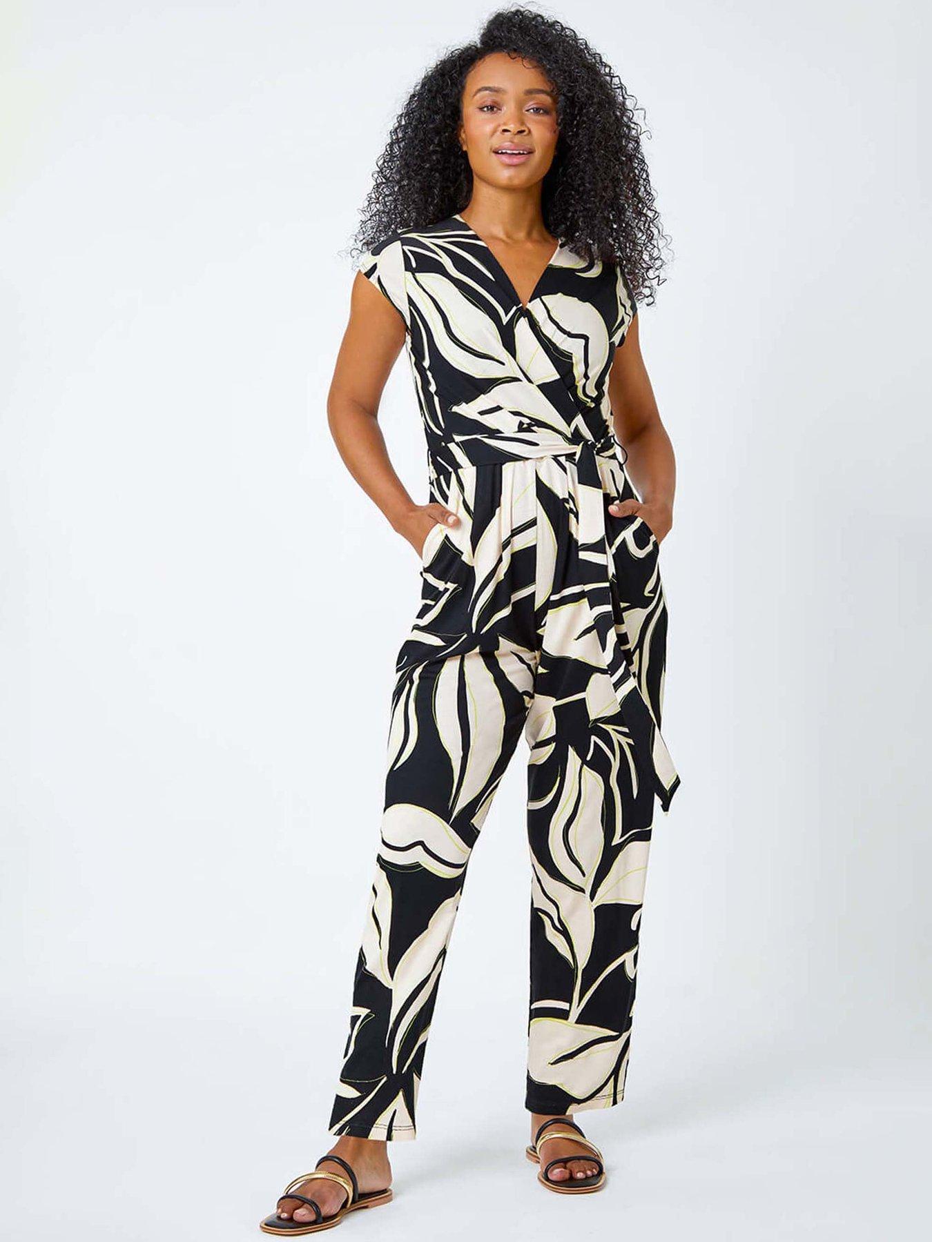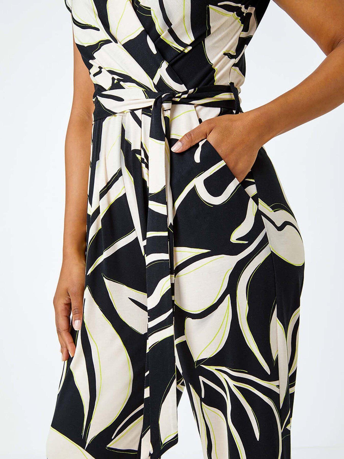 Roman Petite Leaf Print Stretch JumpsuitElevate your casual collection with this timeless wrap jumpsuit. Ideal for dressing up or down, this piece is cut from a breathable stretch jersey fabric and features a flattering v-neckline and cap sleeve finish. It has pockets for a functional twist as well as a detachable belt for the option of contouring your figure. A floral leaf print adds a timeless feeling. Wear with trainers for an eyecatching daytime style or swap out feels heels and you're ready for a garden party!