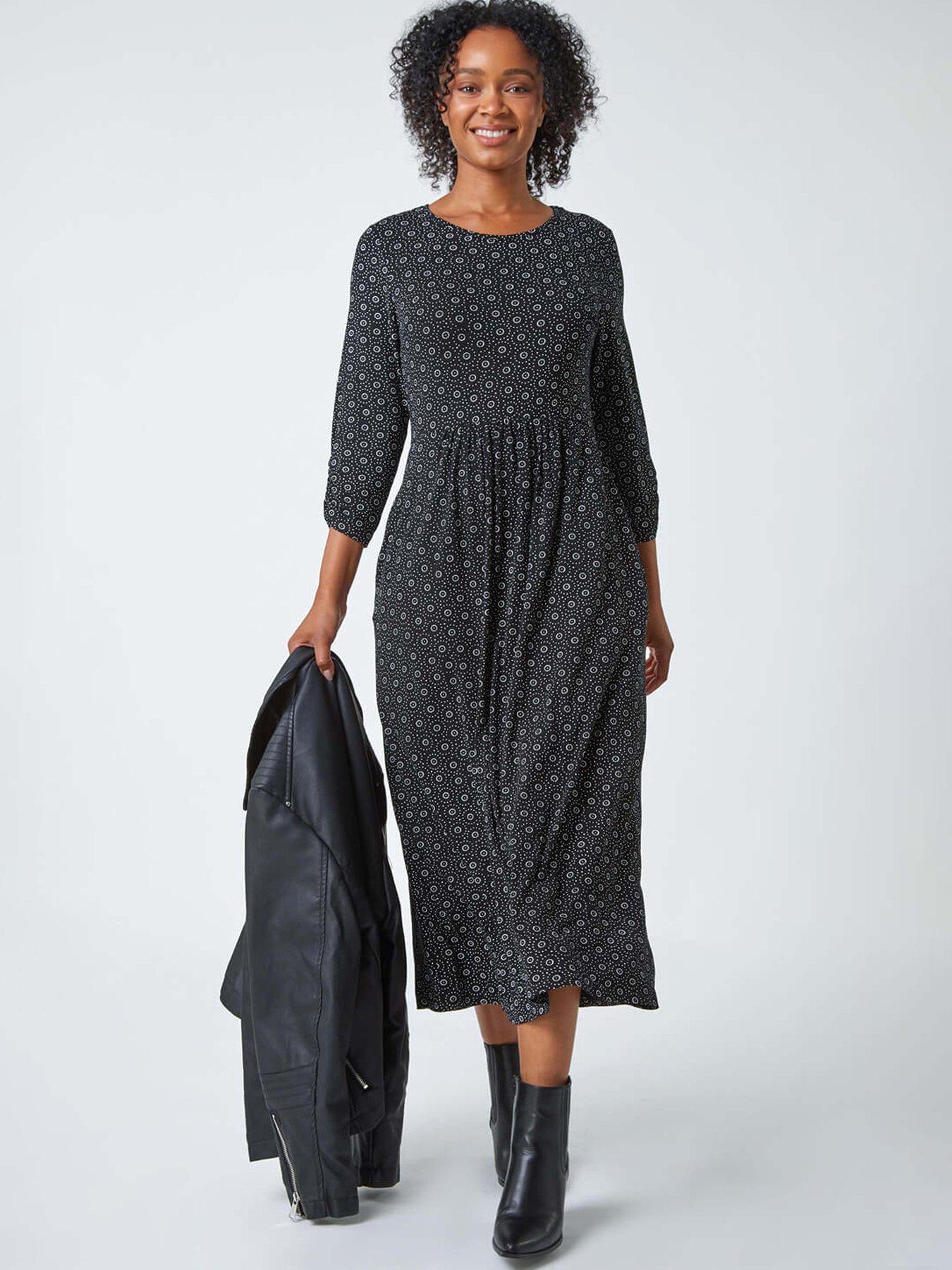 Roman Petite Spot Pocket Stretch Ruched Midi Dress - BlackGet spotted this season wearing this cutesy spot print dress. Designed with a flirty round neckline and 3/4 length sleeves, this style is feminine and flattering for everyday wear. This piece features a playful polka dot print and pocket details for a flattering fit. Topped off with a midi length skirt, this dress is easy to pull on over the head with its stretch jersey fabric and elasticated waist. Pair with ankle boots and a leather jacket for a fabulous Autumn style.