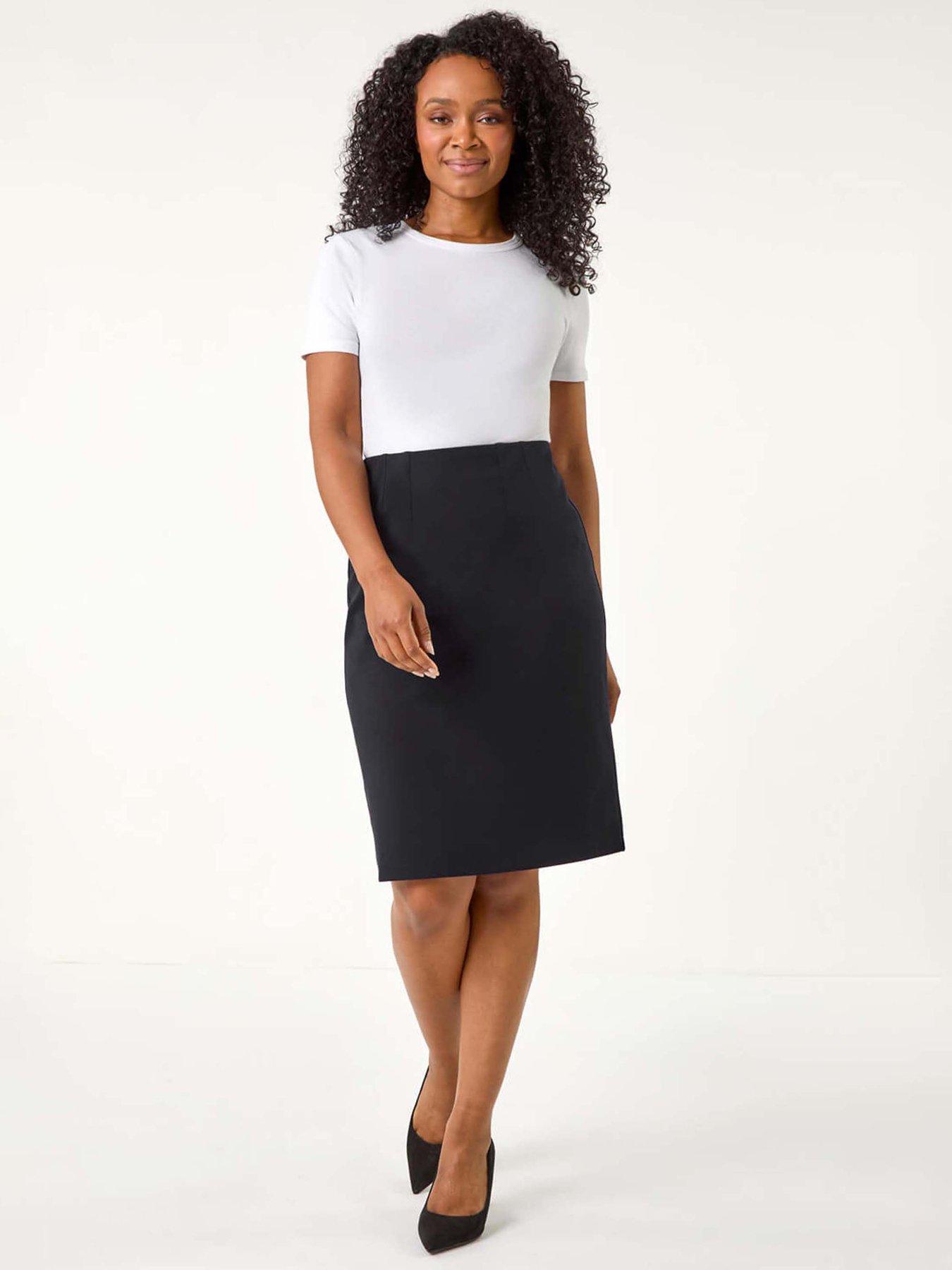 Roman Petite Stretch Pencil Skirt - BlackAchieve effortless style with this versatile knee length stretch skirt this Autumn/Winter. Designed with comfort in mind this skirt features an elasticated waistband and pull-on style for easy wearing. The darts on the waist create a flattering fit while the vent at the back hem adds a touch of elegance. Perfect for pairing with knitwear and tights this skirt will become your go to piece for both casual and smart looks!