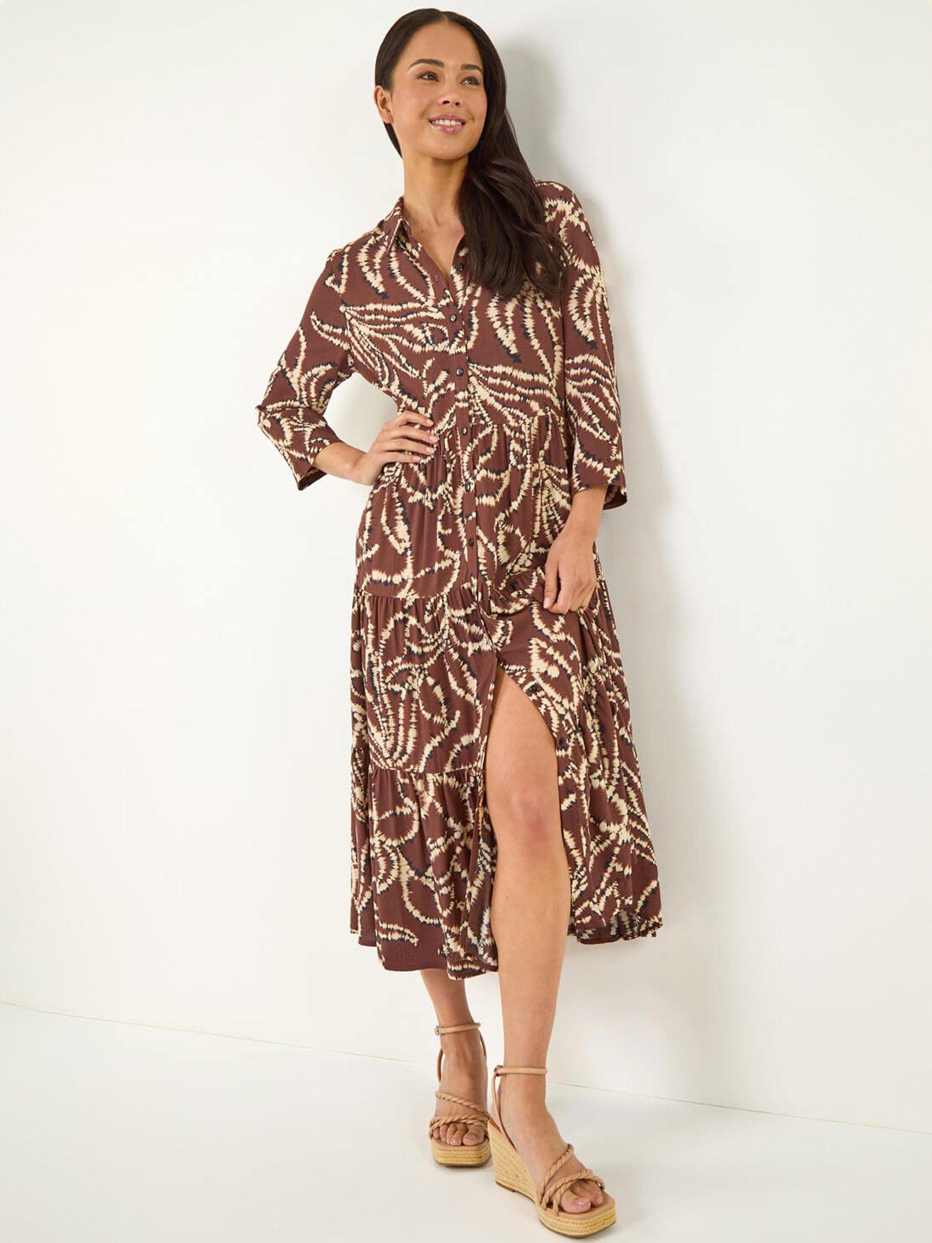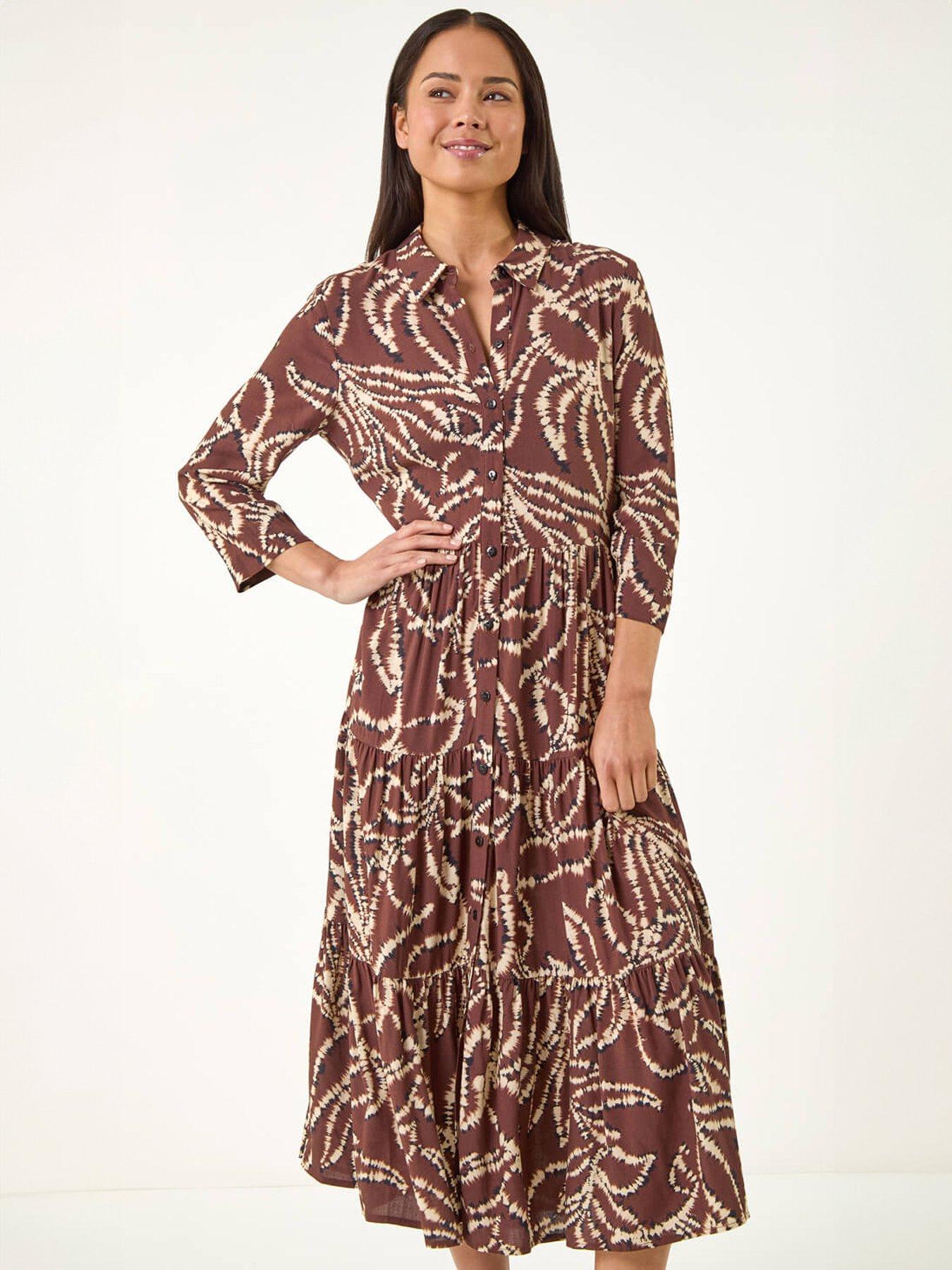 Roman Petite Tiered Midi DressFeel effortlessly chic in this tiered dress the perfect addition to your Autumn/Winter wardrobe. Featuring a round neck with a shirt collar and a smart button-up fastening on the centre front bodice this dress exudes style. The tiered skirt offers a flattering fit and flare silhouette crafted from a comfortable woven fabric. Tailored with a midi length and 3/4 length set-in sleeves this dress is perfect for any occasion. Complete the look with ankle boots and a stylish jacket for a truly sophisticated ensemble.