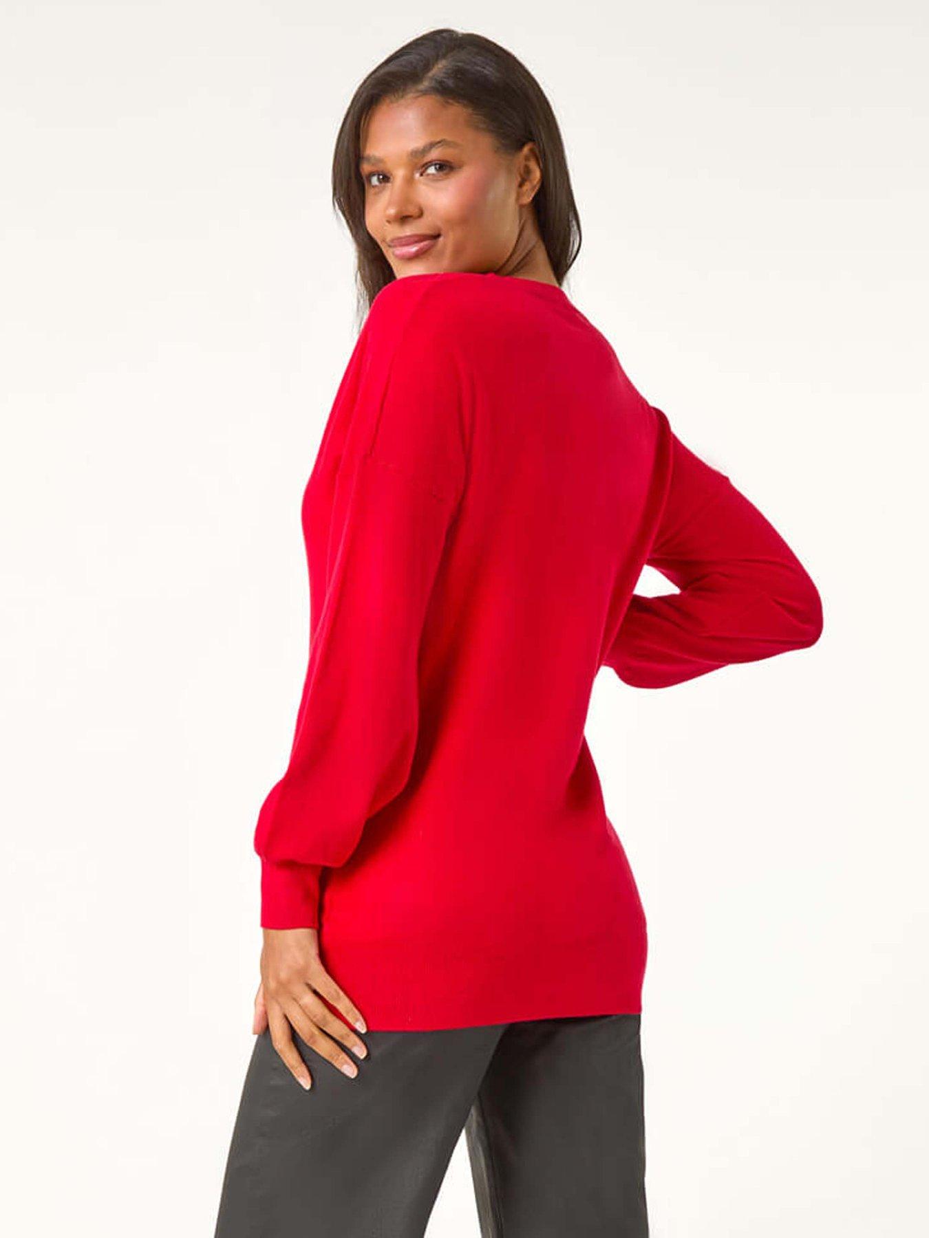 Roman Plain V-neck Stretch Longline Jumper - ScarletThis slouchy boyfriend knit is a classic shape and a timeless piece, essential for every wardrobe, with its flattering v-neckline. This light knit is finished with full length, blouson sleeves, adding shape and cut from a cosy touch fabric. Easy to layer up in winter or wear on its own in Spring, this smart casual style is versatile all year round. Pair this with jeggings for the ultimate chilled weekend ensemble or throw under a blazer for work!