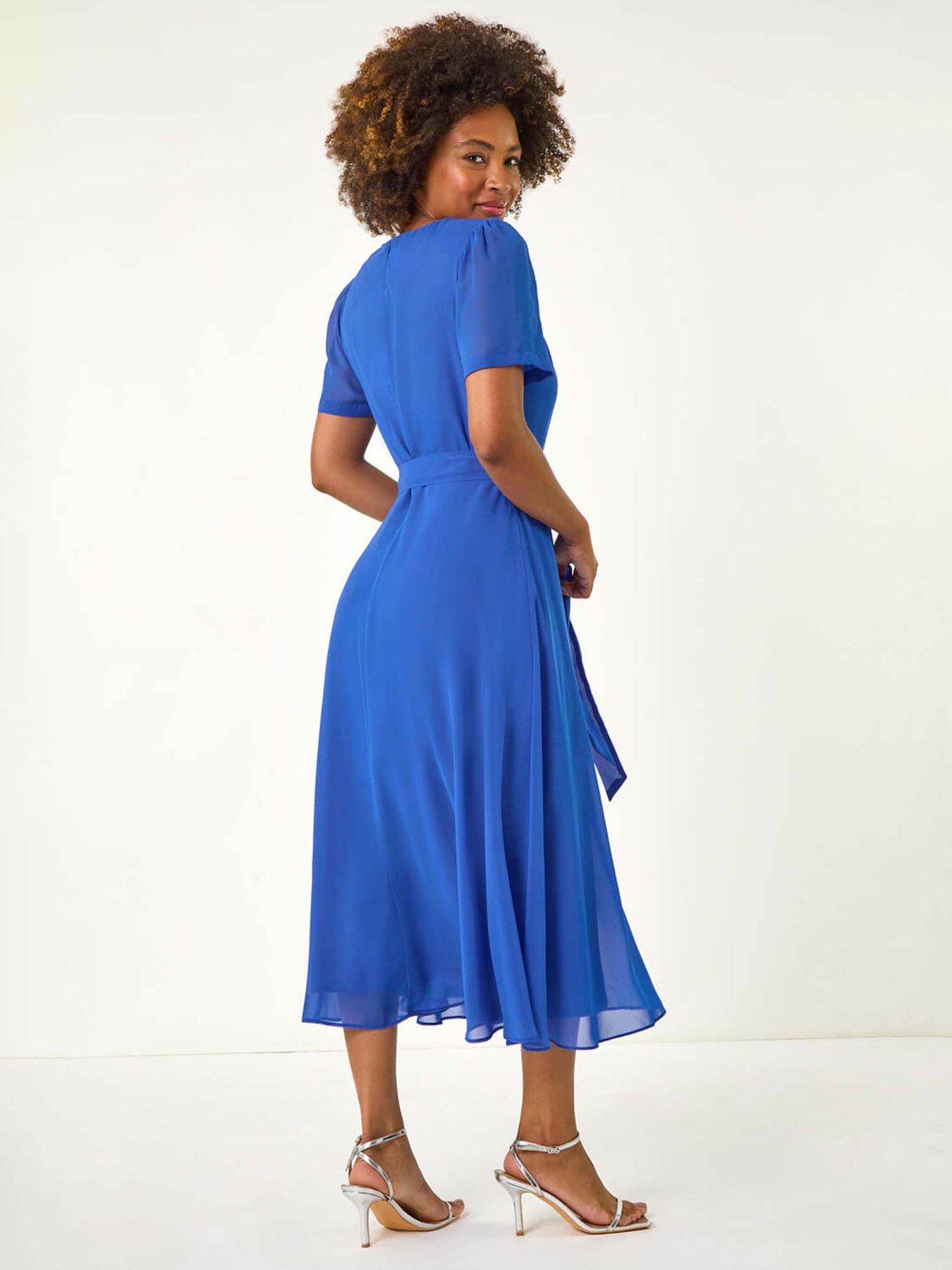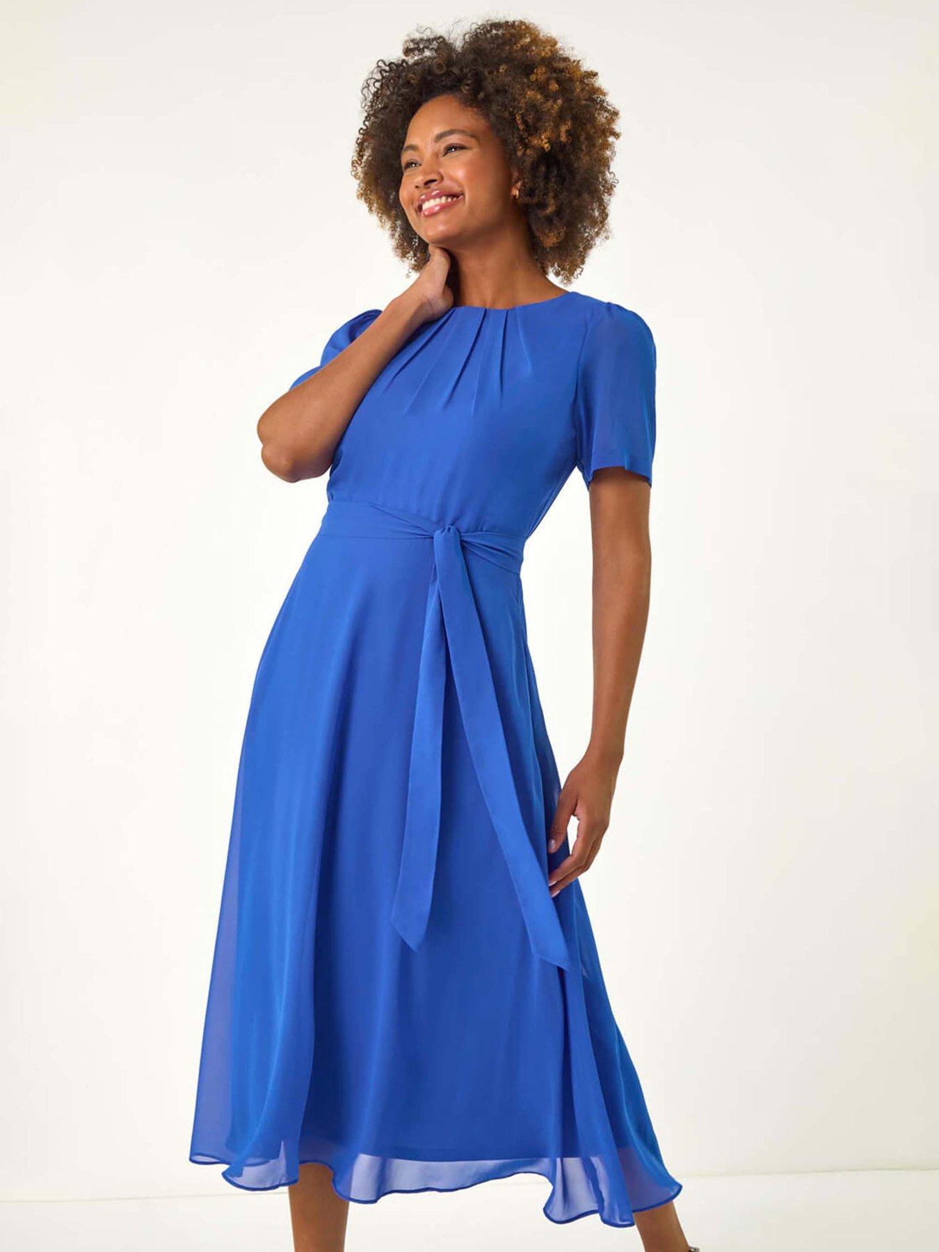 Roman Pleat Chiffon Belted Midi Dress - BlueMake a stylish statement this Spring/Summer season with this flattering yet elegant chiffon dress. The pleated neck detail adds a touch of sophistication while the short sleeves keep it fresh and light. The fit and flare style cinched at the waist with a tie belt showcases your silhouette beautifully. Crafted from light chiffon this dress is perfect for any special occasion. Complete the look with strappy heels and a smart blazer for an effortlessly chic ensemble.