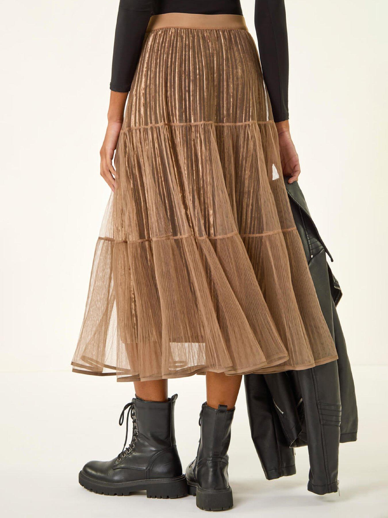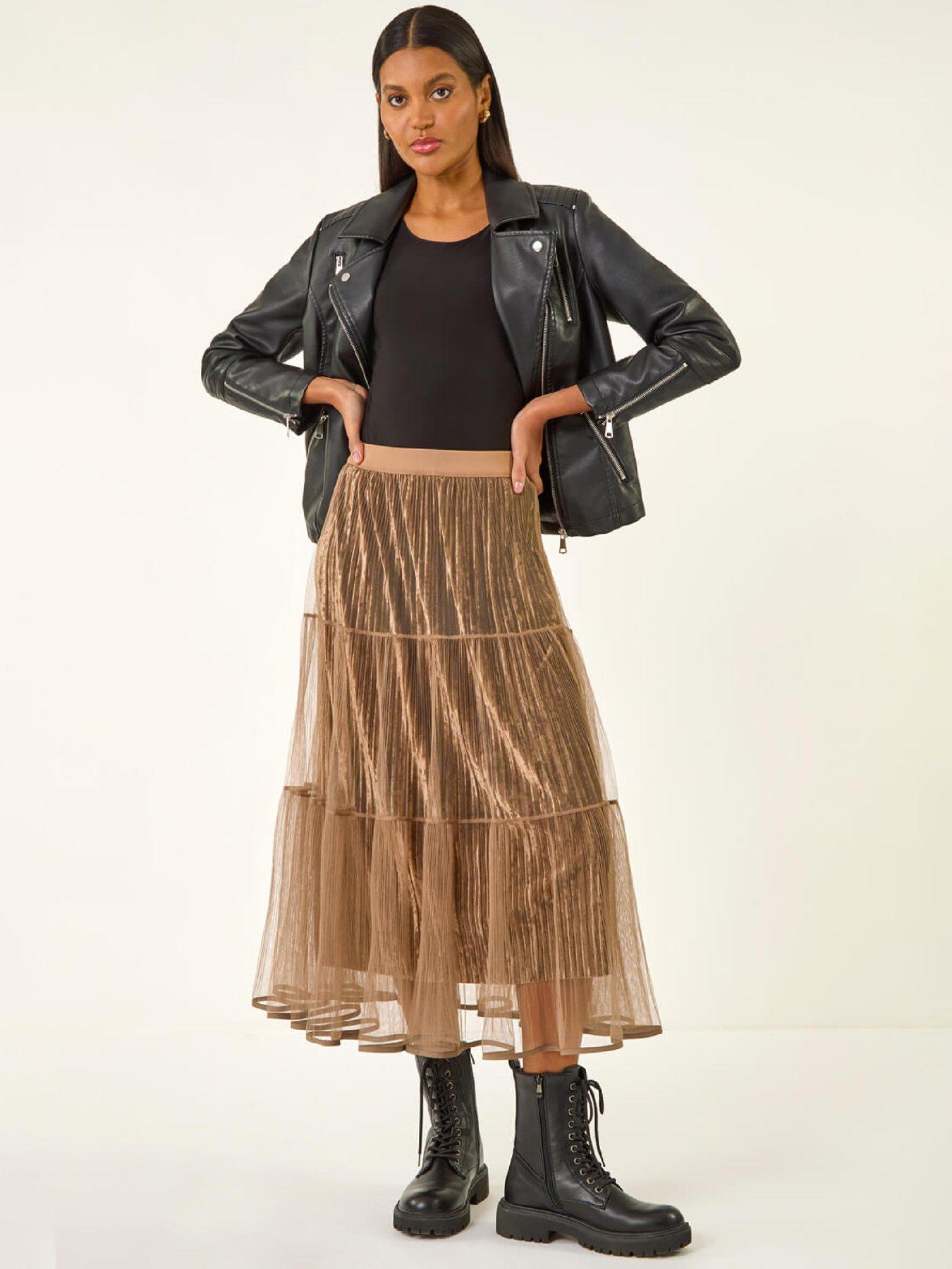 Roman Pleated Velvet Overlay SkirtAdd a touch of luxury to your Autumn/Winter wardrobe with this stunning pleated velvet skirt. The overlay mesh tiered design adds an elegant touch while the comfortable elasticated waist ensures a perfect fit. Fully lined with crushed velour for extra warmth and texture. Pair with a chic shirt tights and heels for a sophisticated and stylish look!