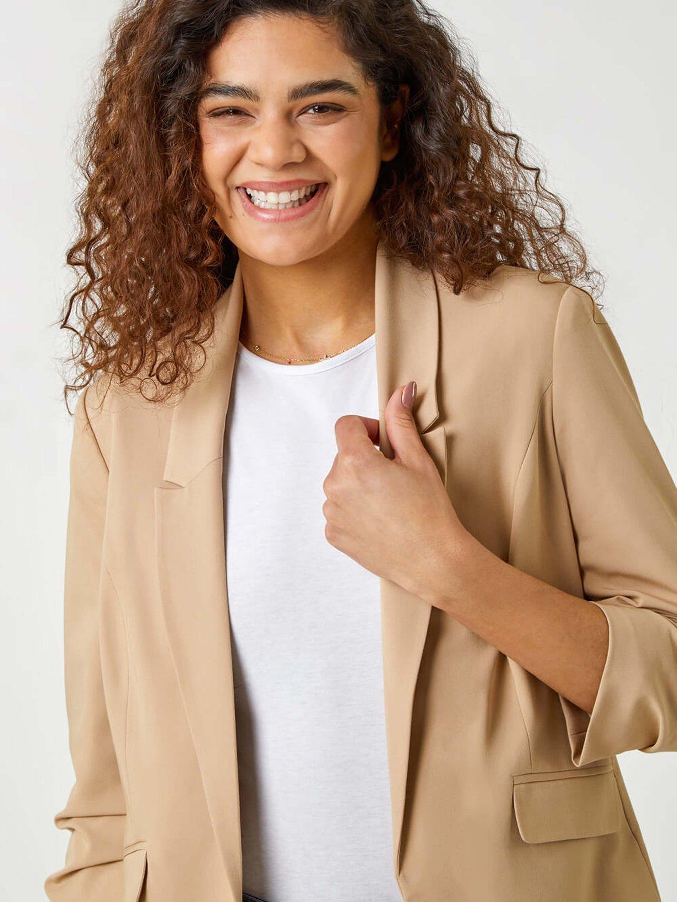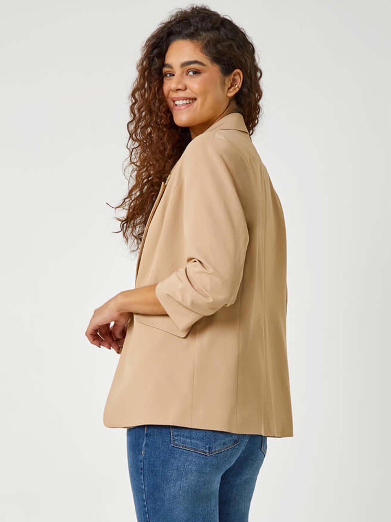 Roman Ruched 3/4 Sleeve Stretch Blazer - NaturalA wardrobe winner! This smart blazer is the versatile jacket your wardrobe needs. Made with stylish lapels and 3/4 ruched sleeves, this collared blazer has two functional front pockets and is completely lined. Team yours with jeans and a t-shirt for a smart-casual look to take you through the day or why not add to your workwear collection.Material & Care