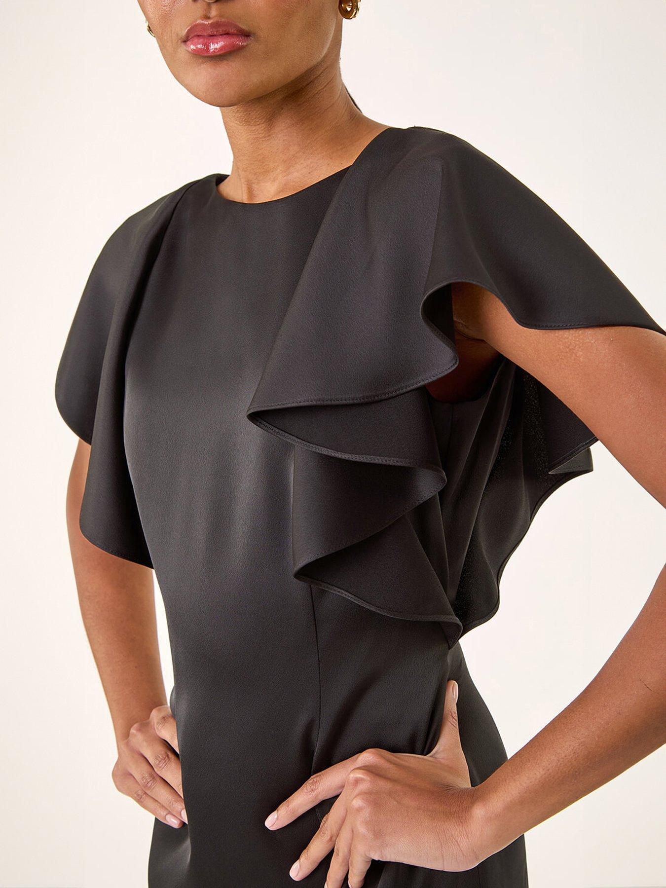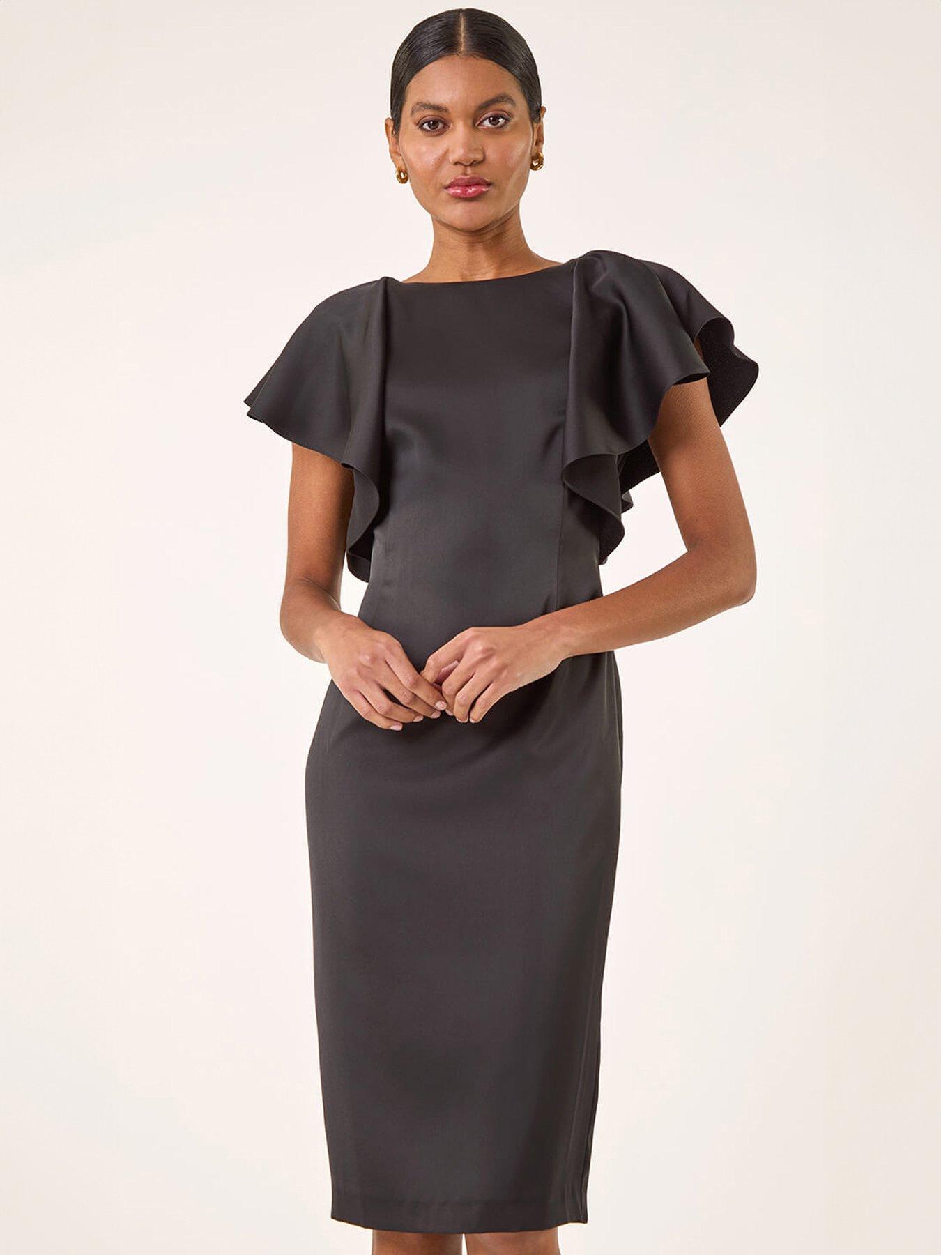 Roman Satin Ruffle Midi DressWrap yourself in elegance with our satin midi dress crafted from smooth satin fabric. Falling at a flattering midi length this dress features delicate ruffle detailing for a feminine touch. Designed with a classic round neckline and fitted cap sleeves this dress exudes sophistication effortlessly. Style with strappy heels and a trendy bolero to complete your polished look.