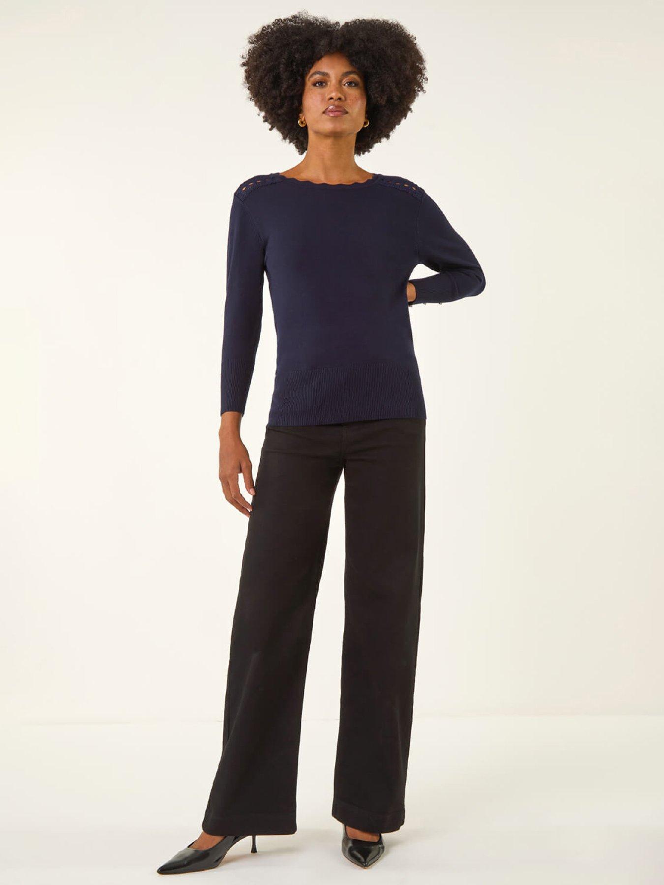 Roman Scalloped Neck Knit Jumper - NavyIndulge in feminine elegance with this scallop lace knit jumper perfect for Autumn/Winter. The delicate scallop neckline and lace sleeves add a touch of romance while the hardwear buttons on the cuffs bring a modern twist. The long sleeves provide extra w