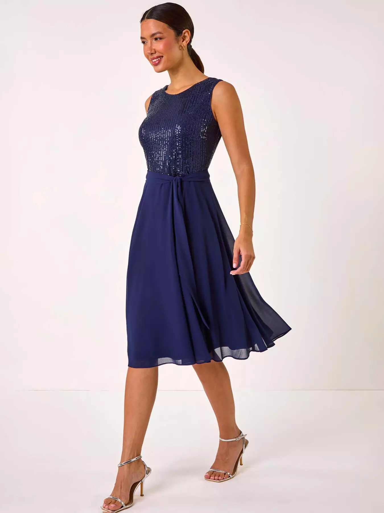 E.A.N: 5 0 6 3 5 6 6 0 3 6 2 0 8Roman Sequin Bodice Belted Chiffon Dress - Navy