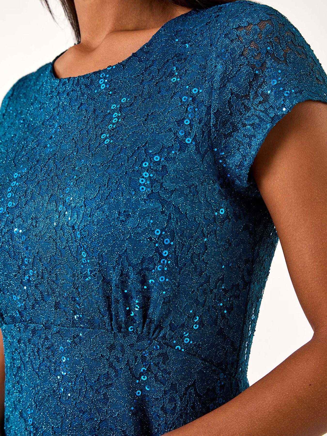 Roman Sequin Fluted Hem Lace Stretch Dress - TealLace oozes feminine elegance and this dress is no exception! Cut from a comfortable stretch lace fabric with glitter detailing throughout this glitzy dress is an eye-catching party piece. It features a modest round neckline short capped sleeves and a feminine fluted hemline that combine to create a sophisticated silhouette. Pair with heels and a fur jacket and you're good to go!