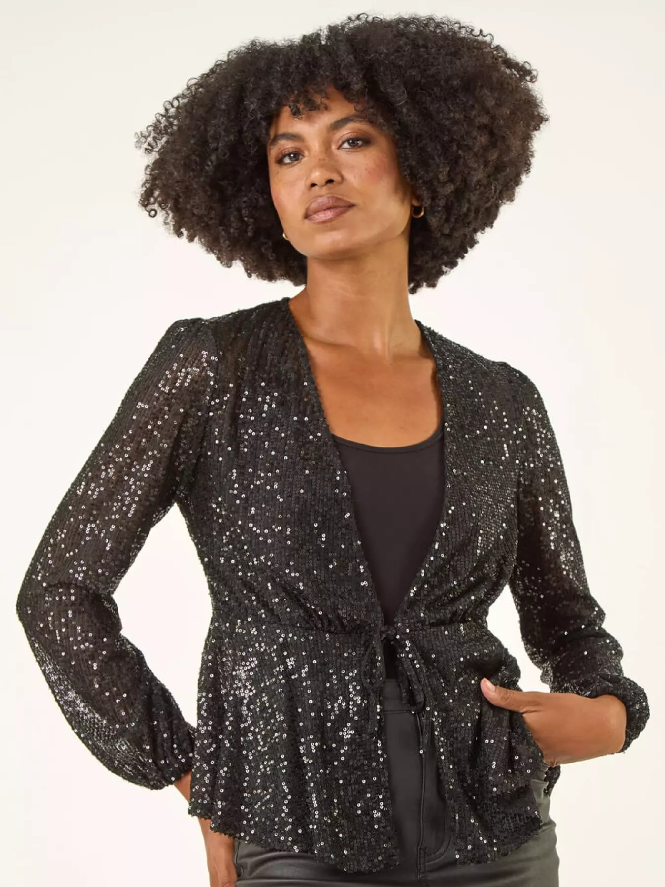 E.A.N: 5 0 6 3 5 6 6 4 7 7 5 2 0Roman Sequin Tie Front Stretch Top - Black