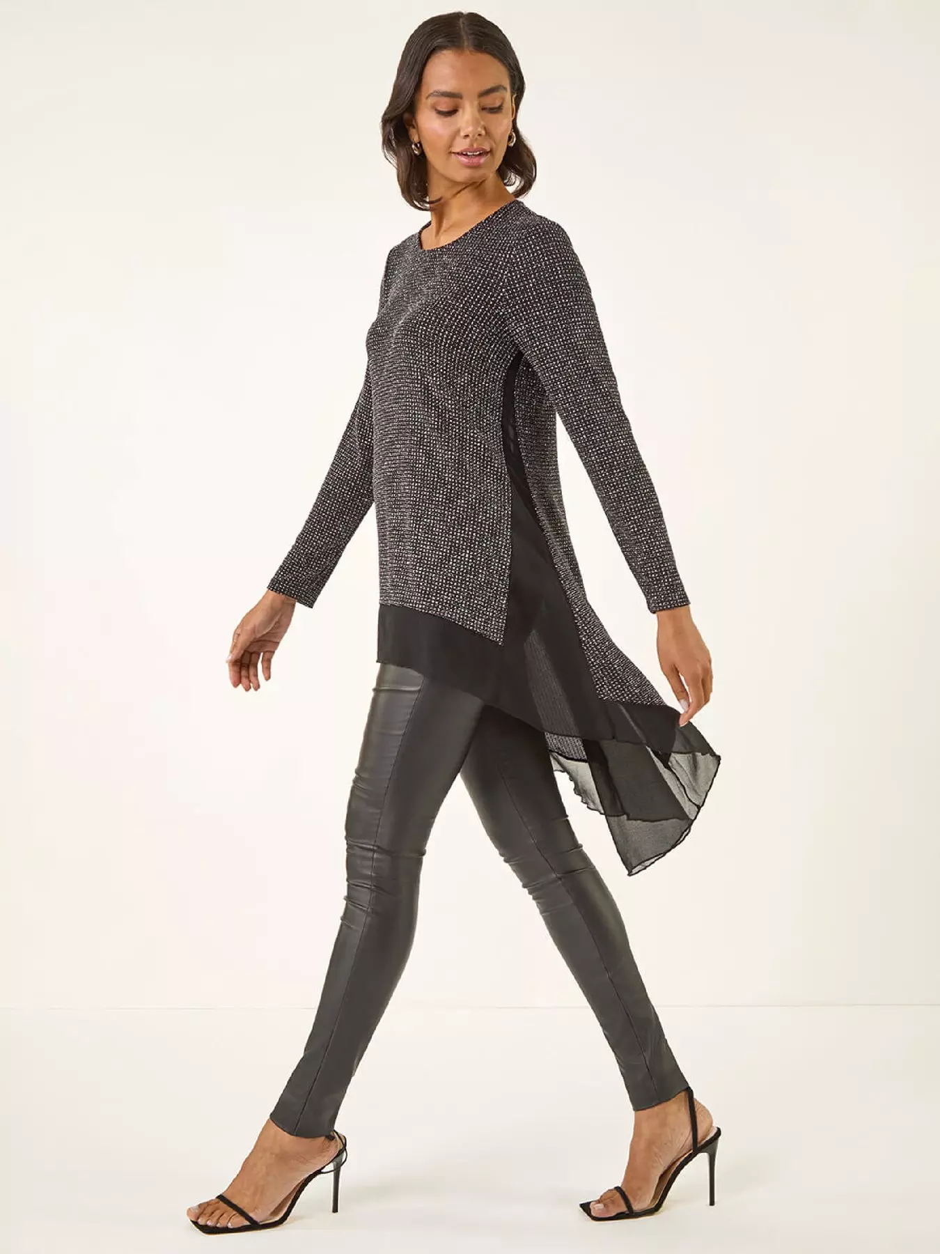 Get ready to shimmer and shine in this stunning textured chiffon top for the Autumn Winter season. Crafted from a luxurious textured jersey fabric this top features a flattering round neckline and elegant long sleeves. The chiffon hem adds a touch of sophistication to the tunic shape making it perfect for any special occasion. Pair with leather trousers and heeled boots to elevate your party look with a touch of glamour!- Material Content: 86% Polyamide 9% Metalised Fibre 5% Elastane Contrast Fabric: 100% Polyester