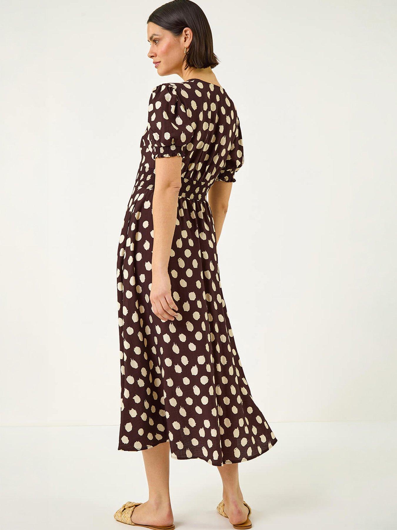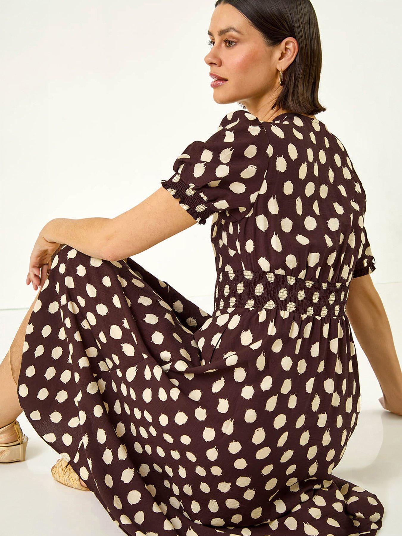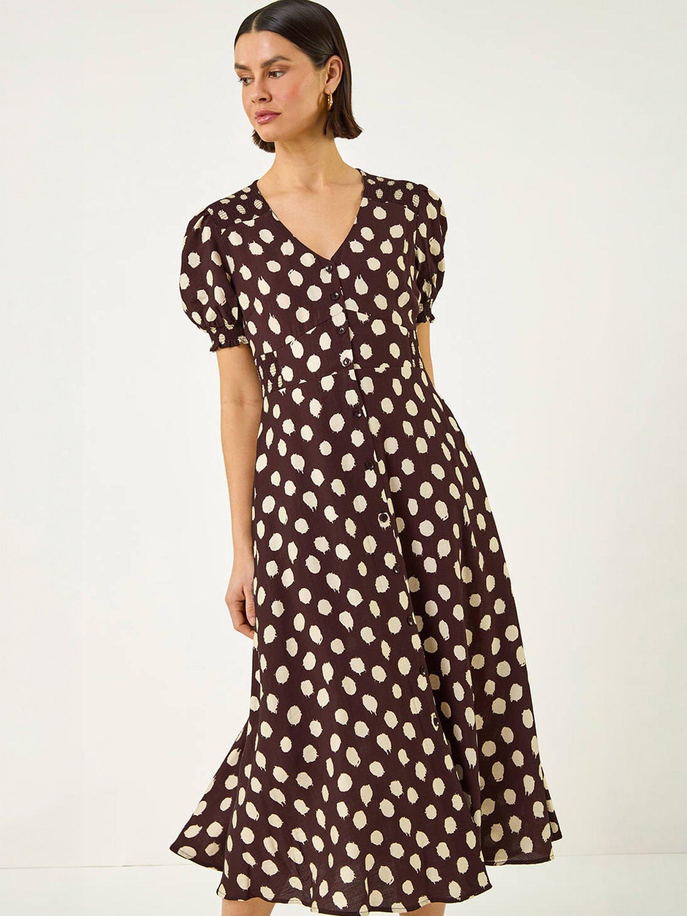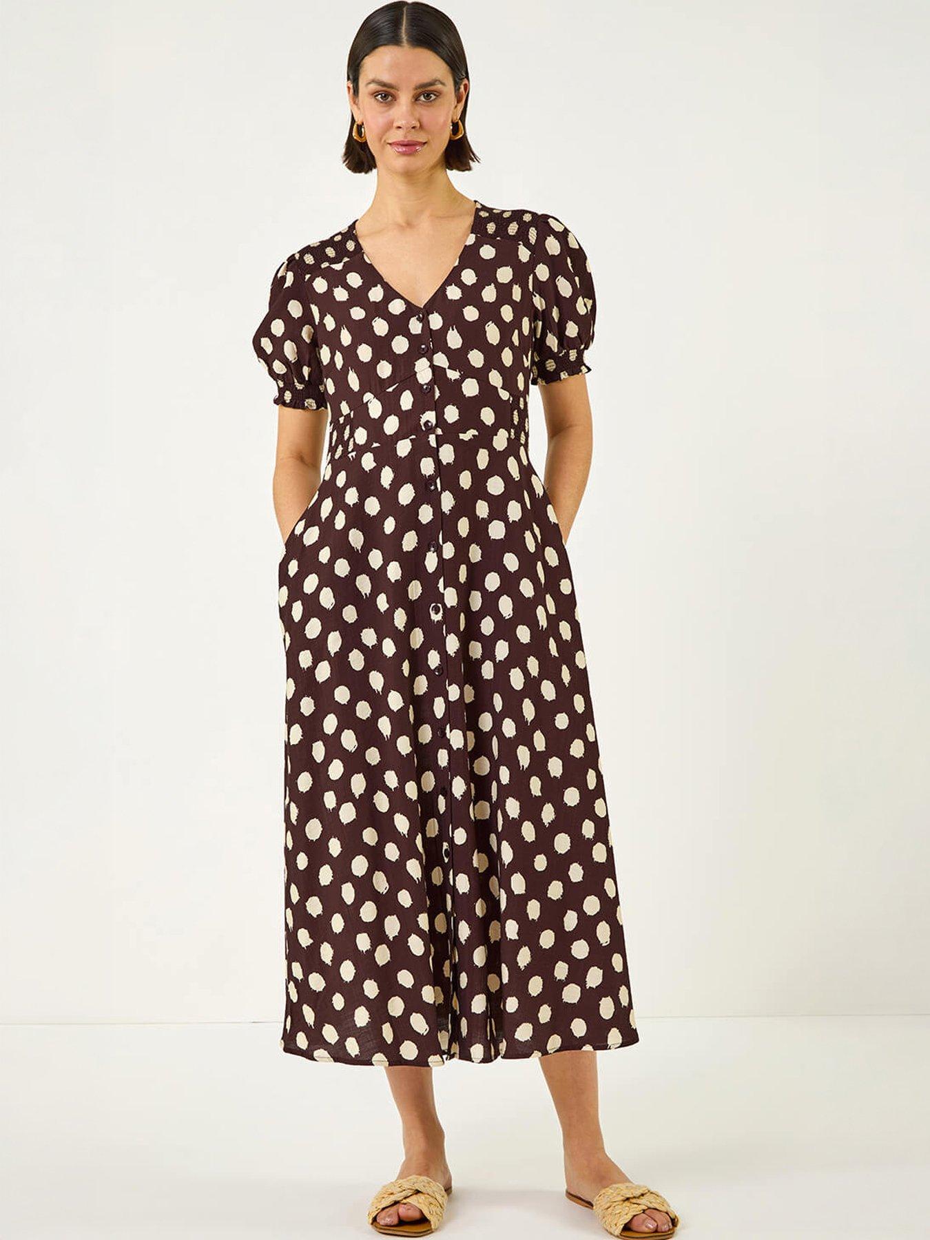 Roman Spot Print Button Midi DressGet ready to embrace the sunshine in style with this spot button midi dress. Featuring a feminine v-neckline and short puff sleeves this comfortable woven fabric dress is adorned with a playful spot print. The midi length and button-through detail add a touch of elegance while the shirred waist ensures a flattering fit. Complete with side pockets for your essentials pair this dress with a denim jacket for the perfect look!