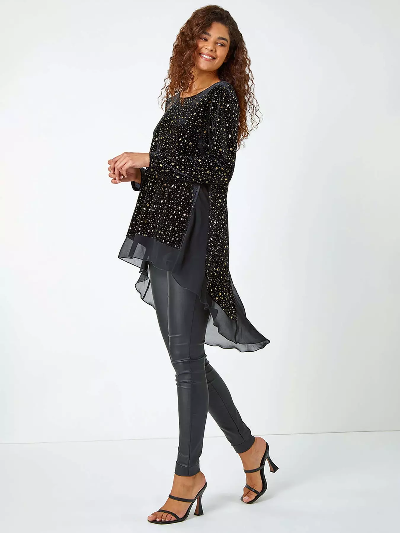 Have your party guests starry-eyed with this fabulous velvet longline top. Cut from a stretch jersey for easy pull-on dressing, this piece features a round neckline and flattering full length sleeves. A metallic foil star print adds a glitzy element whilst a hi-low chiffon hem and split back add a sophisticated touch. Wear with leather trousers for an unforgettable evening style.Material & Care