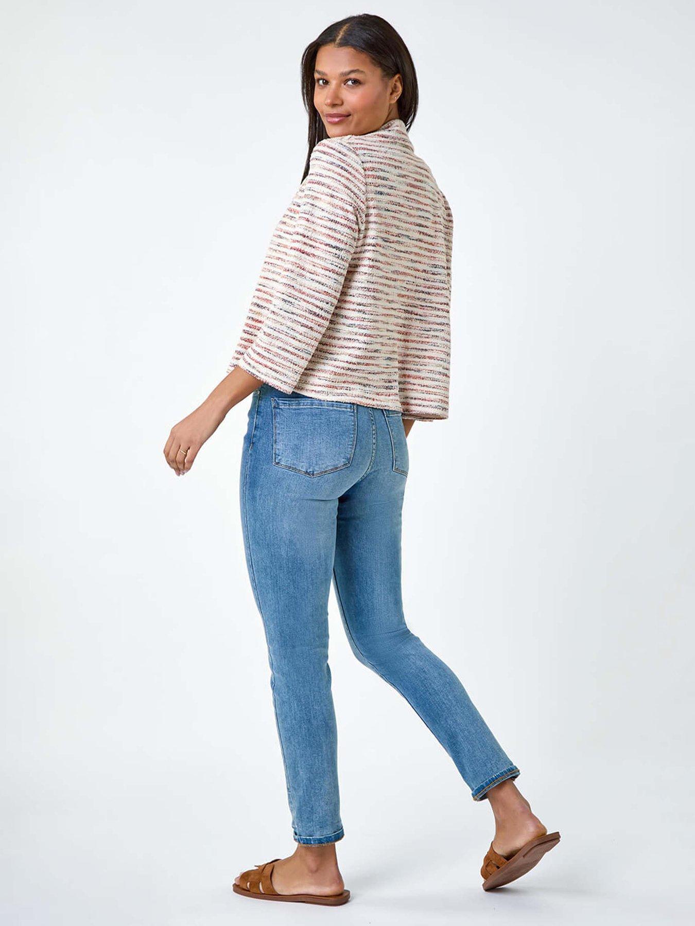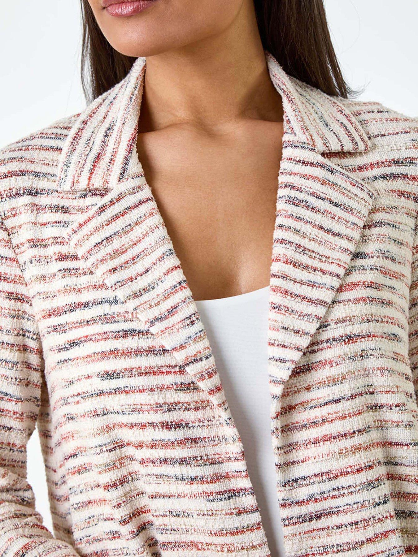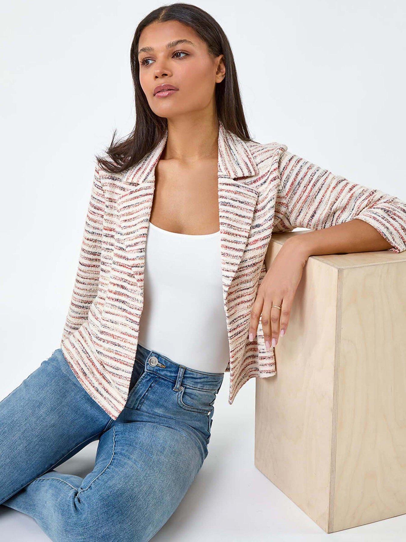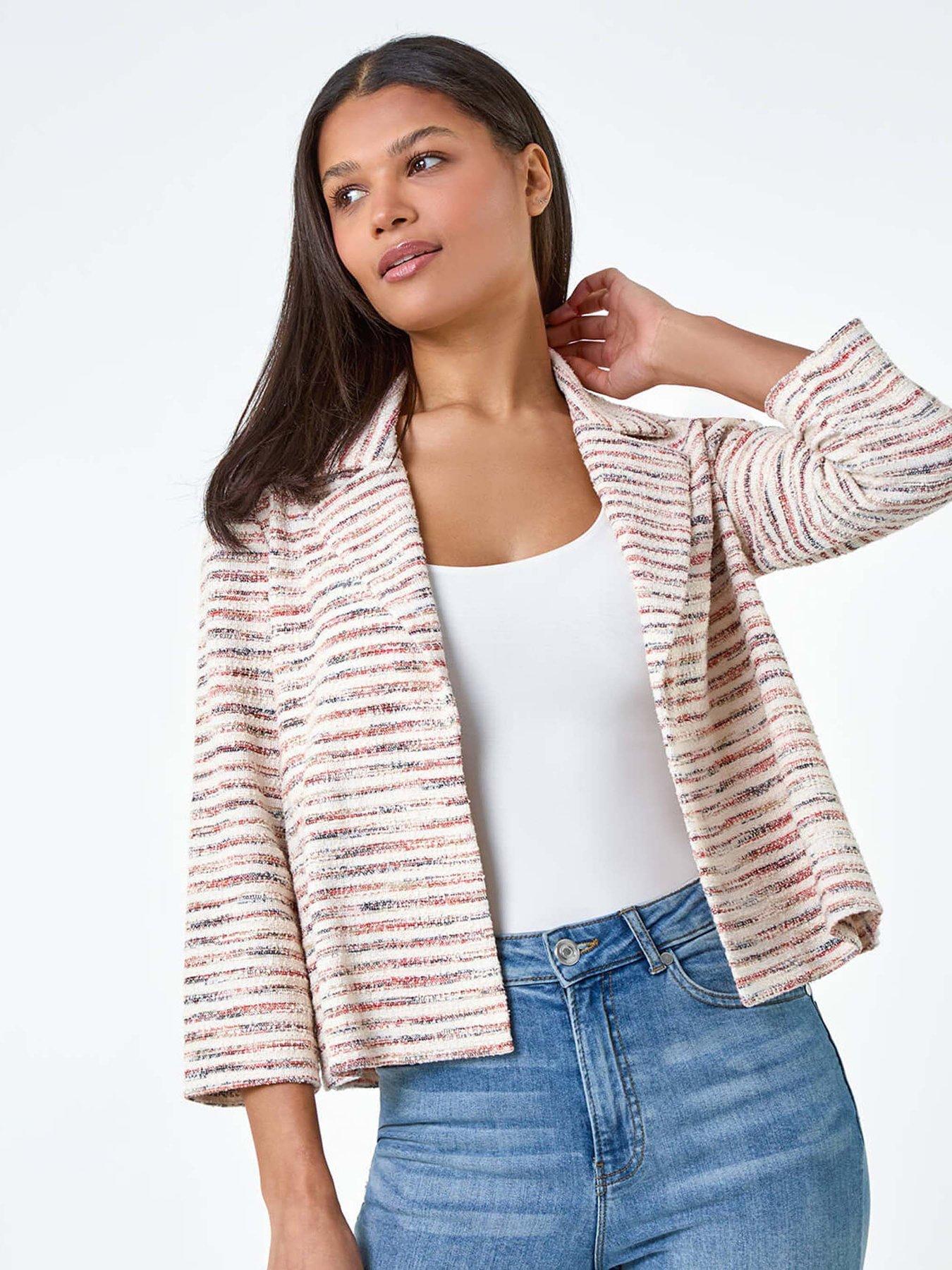 Roman Stripe Textured 3/4 Sleeve Cotton Blend JacketAdd a touch of sophistication to your everyday wardrobe with this striped cotton blend jacket. Crafted from a textured woven fabric with slight stretch, it guarantees all-day comfort. The edge to edge opening and smart rever collar make it a versatile piece which is perfect for desk to dinner dressing. The 3/4 length sleeves add a touch of elegance, while its versatility allows it to be styled effortlessly with wedges and denim jeans for easy transitional dressing.