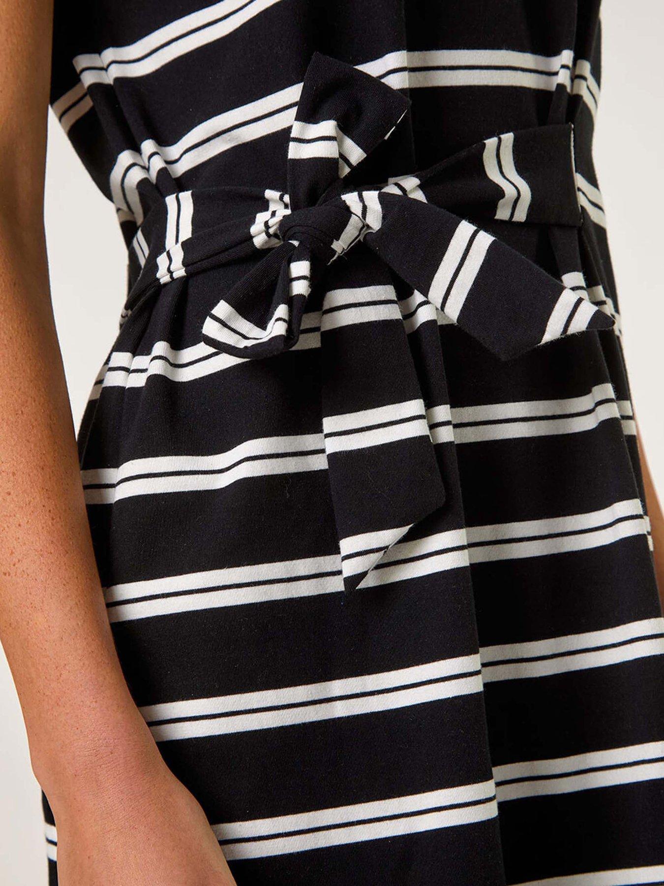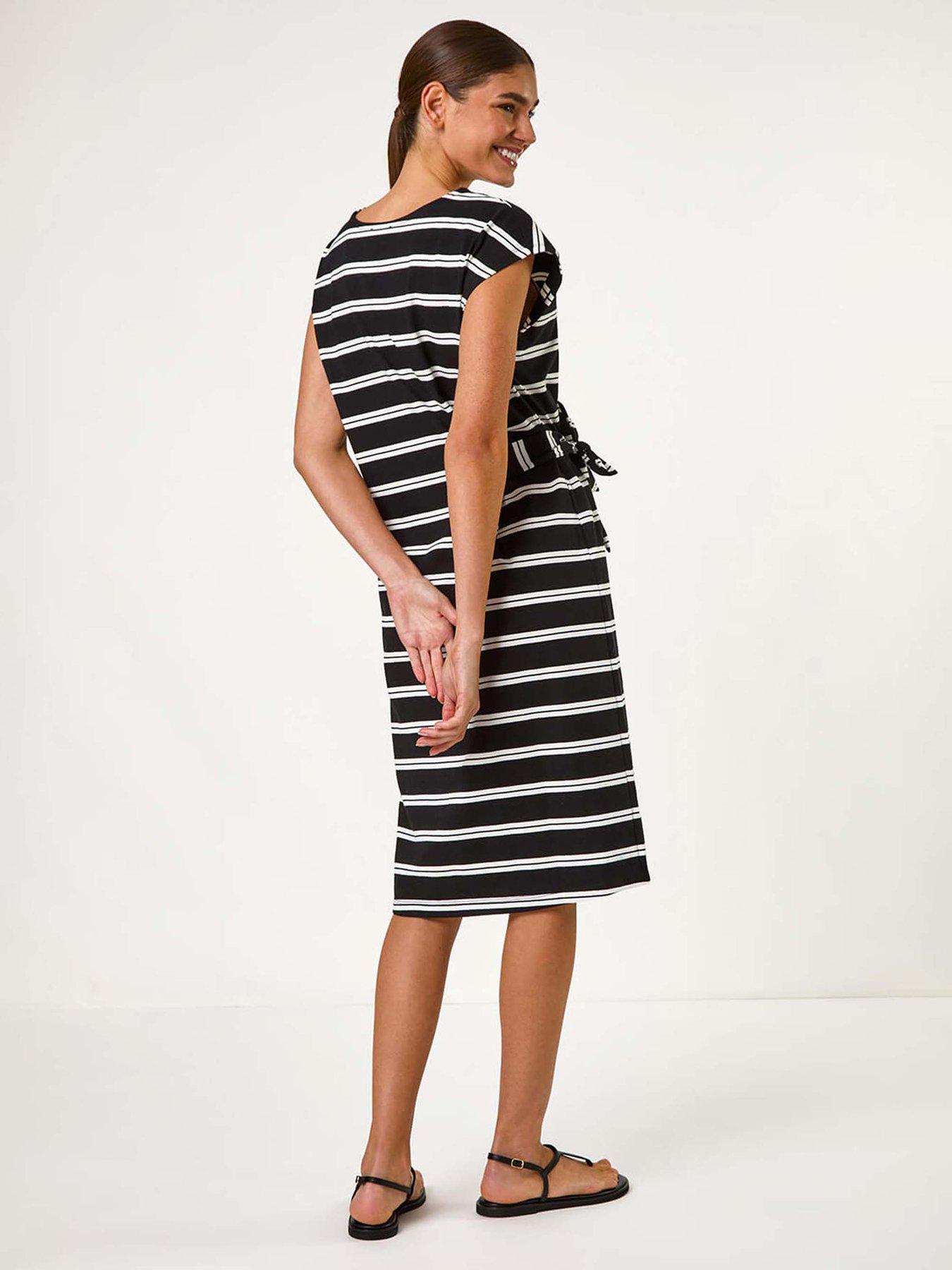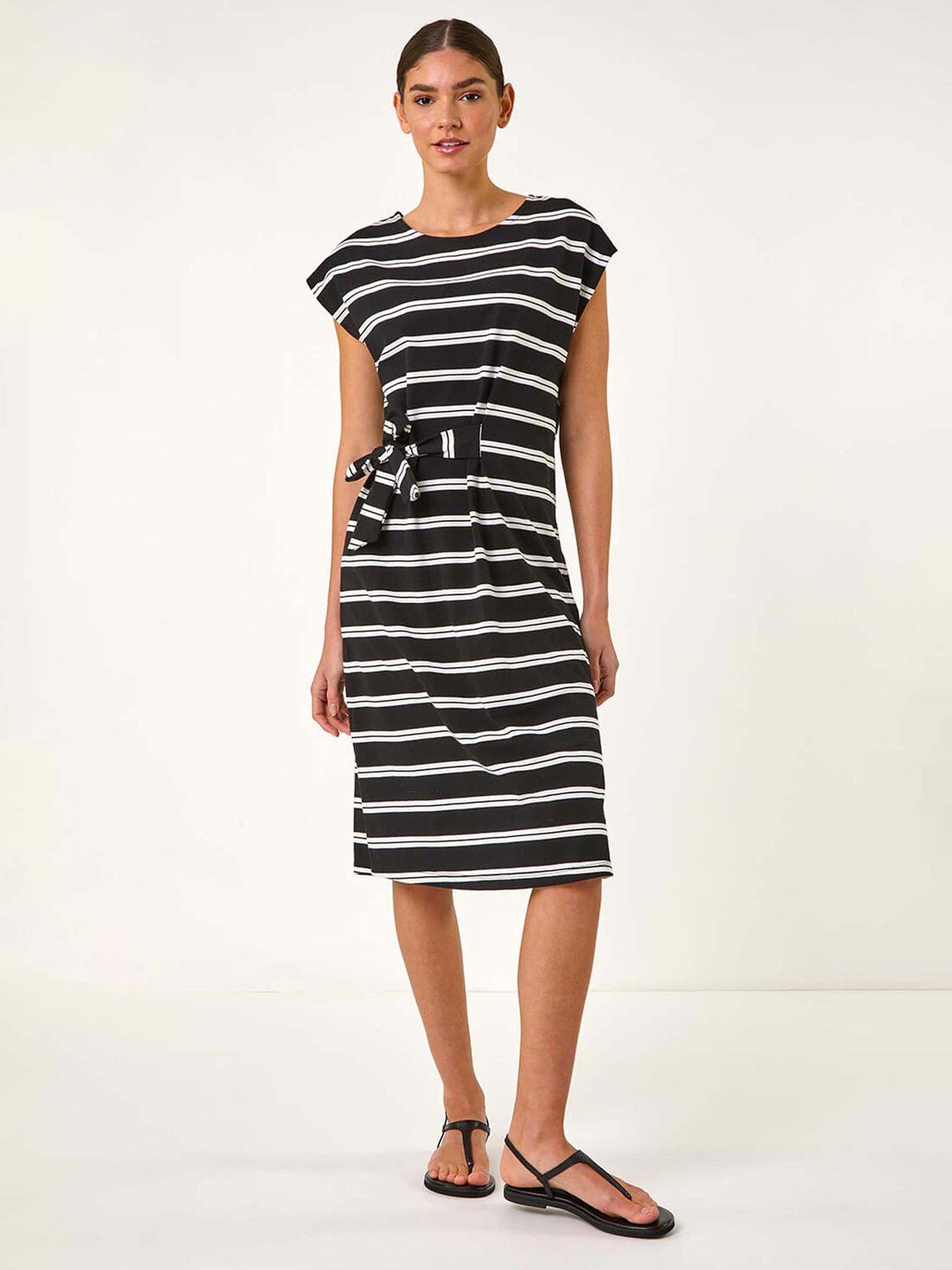 Roman Stripe Tie Side Stretch Midi Dress - BlackMake a statement this Spring/Summer in this fun and fresh stripe tie midi dress. Crafted from stretch jersey fabric this dress boasts an all over stripe pattern and a flattering fit and flare shape. With a classic round neck and short sleeves it features a stylish tie detail at the side for added charm. Perfect for casual days out pair with sandals and a denim jacket for a relaxed and chic look!