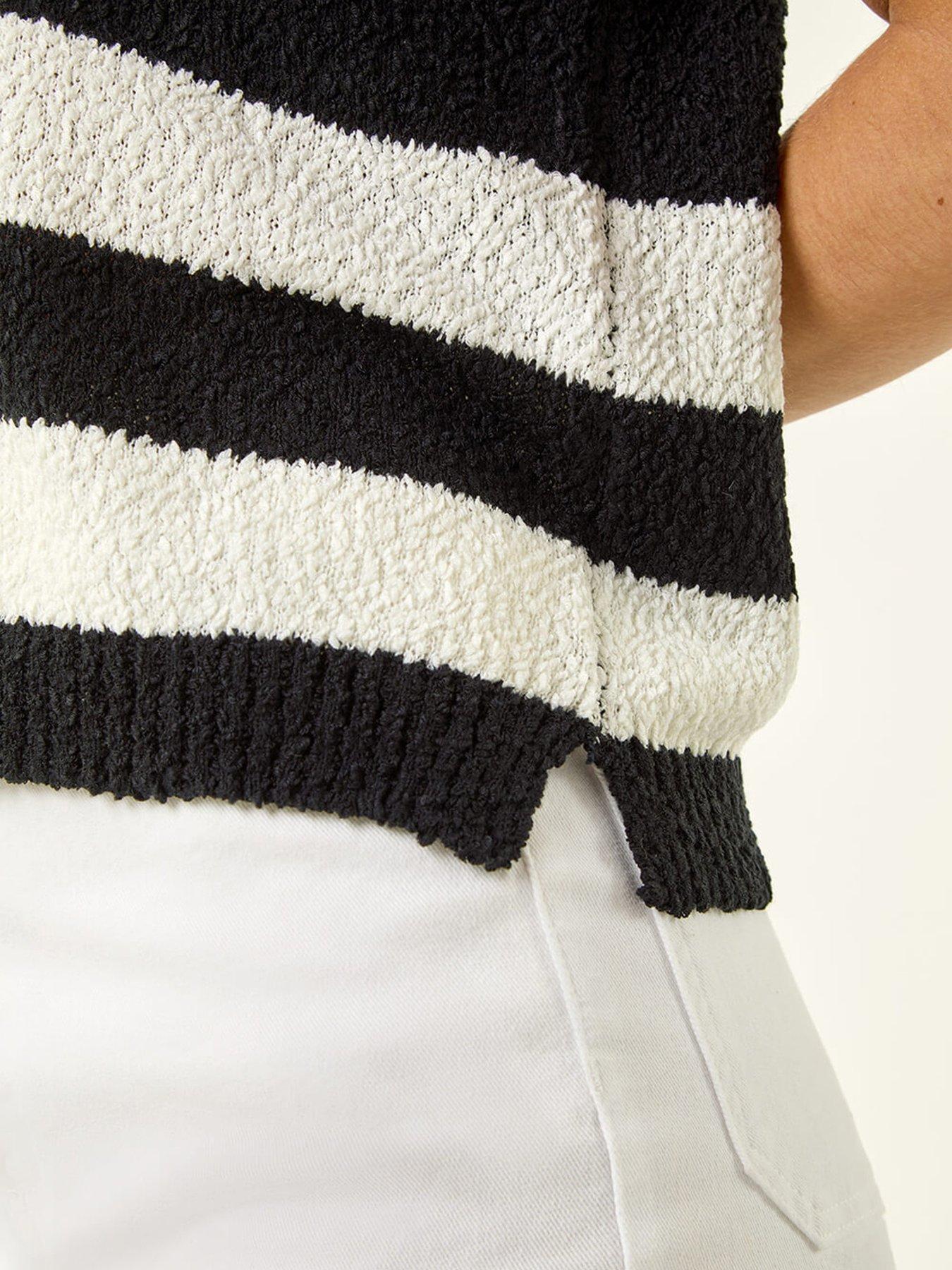 Roman Stripe V-neck Knit VestGet ready for the warmer days ahead with this stylish stripe v-neck vest. Cut from a light weight soft knit fabric this sleeveless vest showcases a flattering v-neckline that adds a touch of sophistication. The vest shape is versatile and easy to layer. Perfect for pairing with wide-leg jeans for a chic look from day to night!